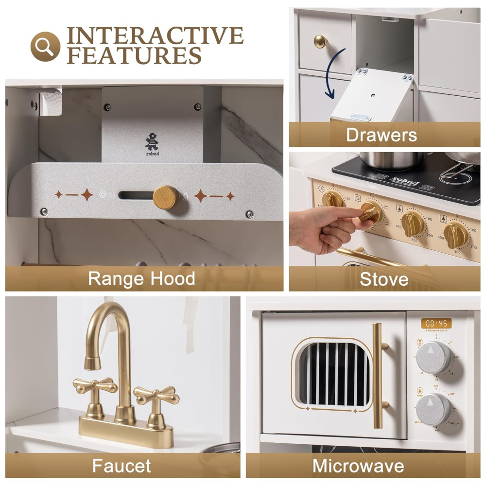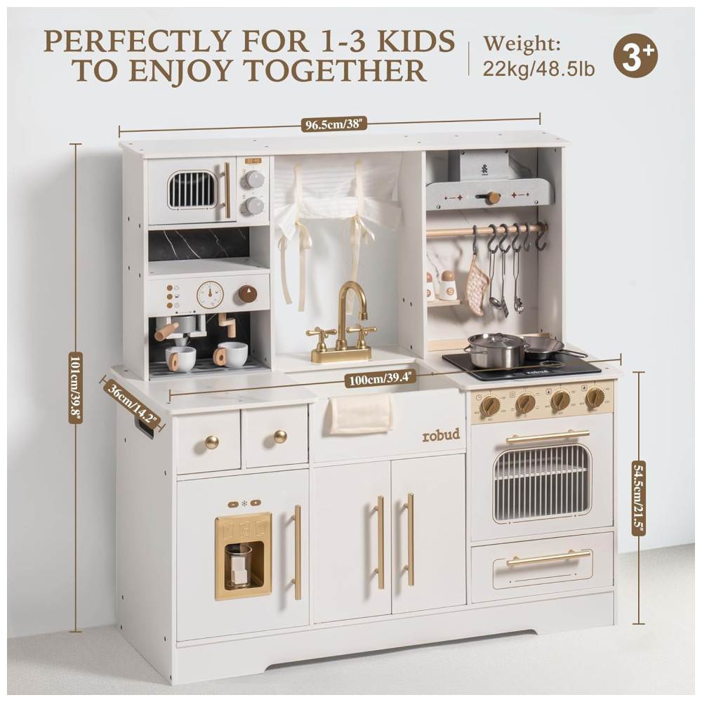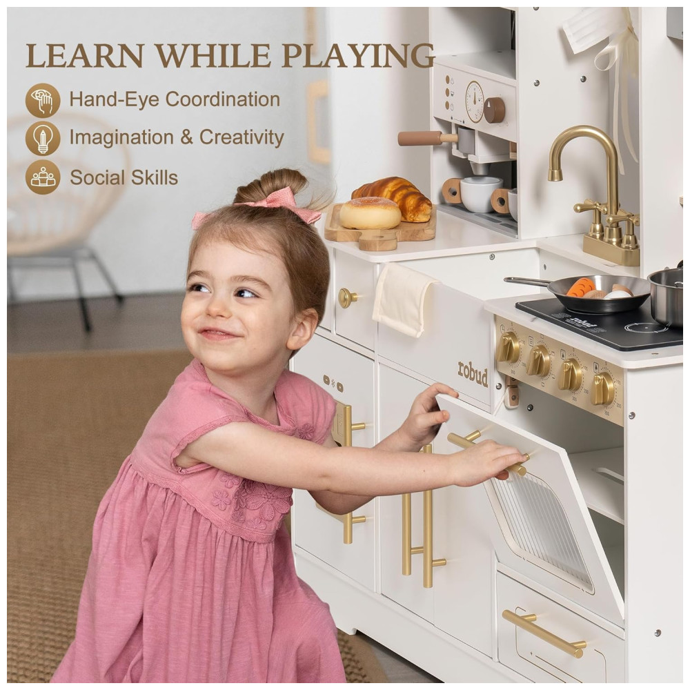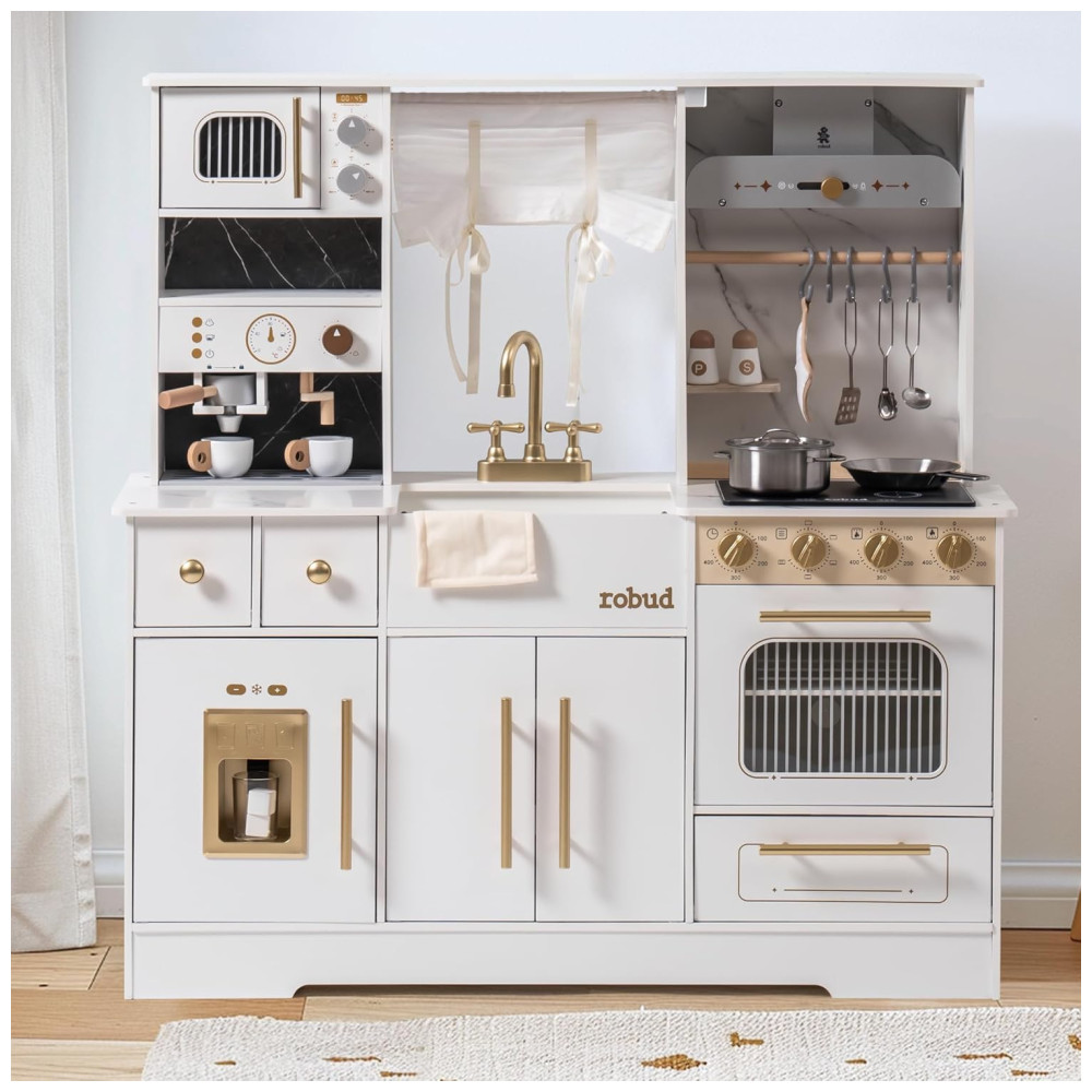 A Cozinha de Brinquedo Deluxe Branca e Dourada da ROBUD traz a brincadeira de cozinha à vida com detalhes como uma torneira real, cafeteira e forno, estimulando a imaginação e criatividade das crianças. Feita com materiais premium, com superfícies lisas e sem odor, e bordas arredondadas para garantir uma brincadeira segura e sem preocupações. Com detalhes interativos como botões giratórios, torneira funcional e porta do forno que abre e fecha, este conjunto imita ações reais de cozinha, ajudando as crianças a desenvolver habilidades valiosas por meio da brincadeira. Sua aparência elegante, com design branco e dourado, se encaixa lindamente em qualquer ambiente. Detalhes como uma cafeteira, cortinas e armários de armazenamento adicionam um toque luxuoso. Fácil de montar, com instruções claras e todas as ferramentas necessárias, perfeito para crianças a partir de 3 anos. Um presente incrível para aniversários, Natal ou qualquer ocasião! Este conjunto de cozinha deluxe cresce com a criança, incentivando a independência e responsabilidade.