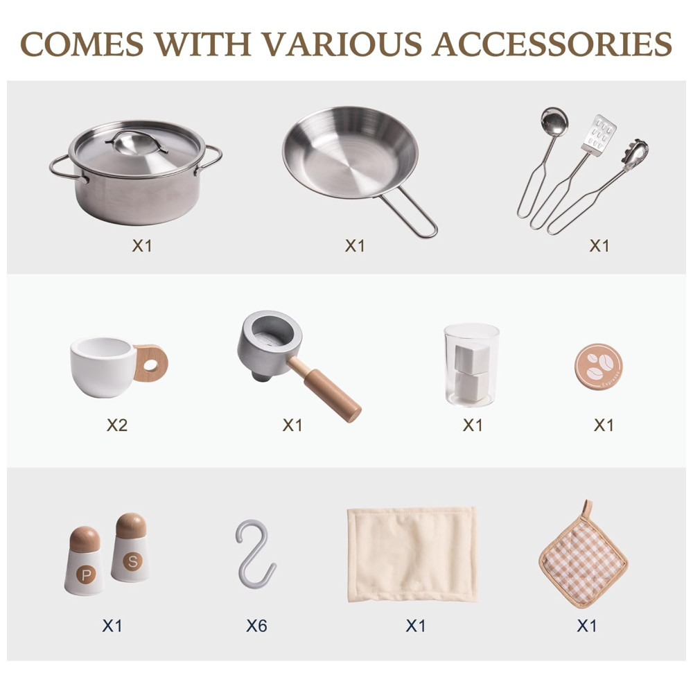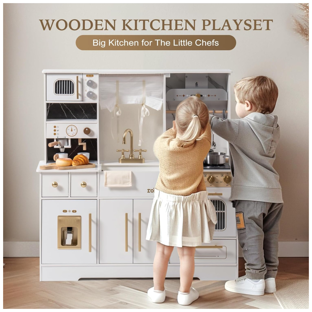 Mini Cozinha Educativa de Madeira ROBUD para Crianças com Máquina de Gelo Cafeteira Forno e Micro-ondas – Conjunto Completo de Utensílios e Armário