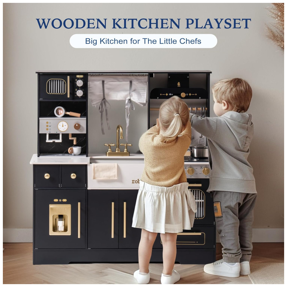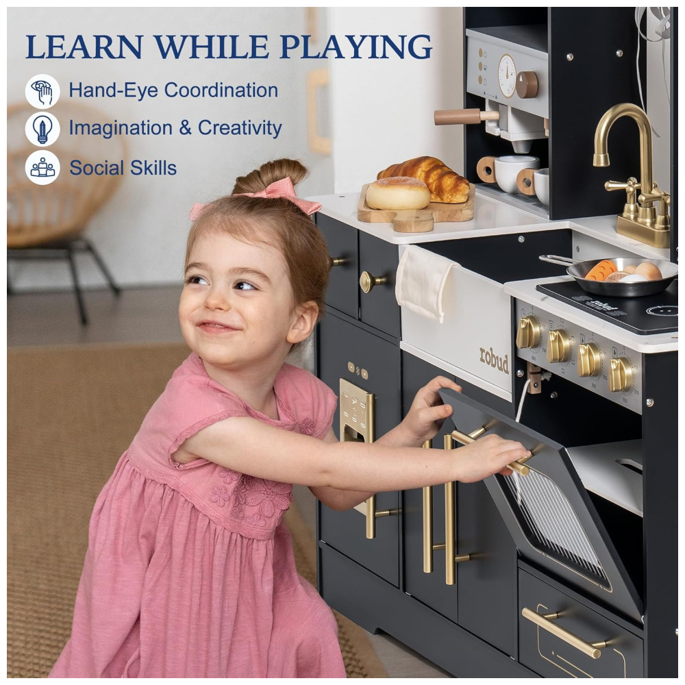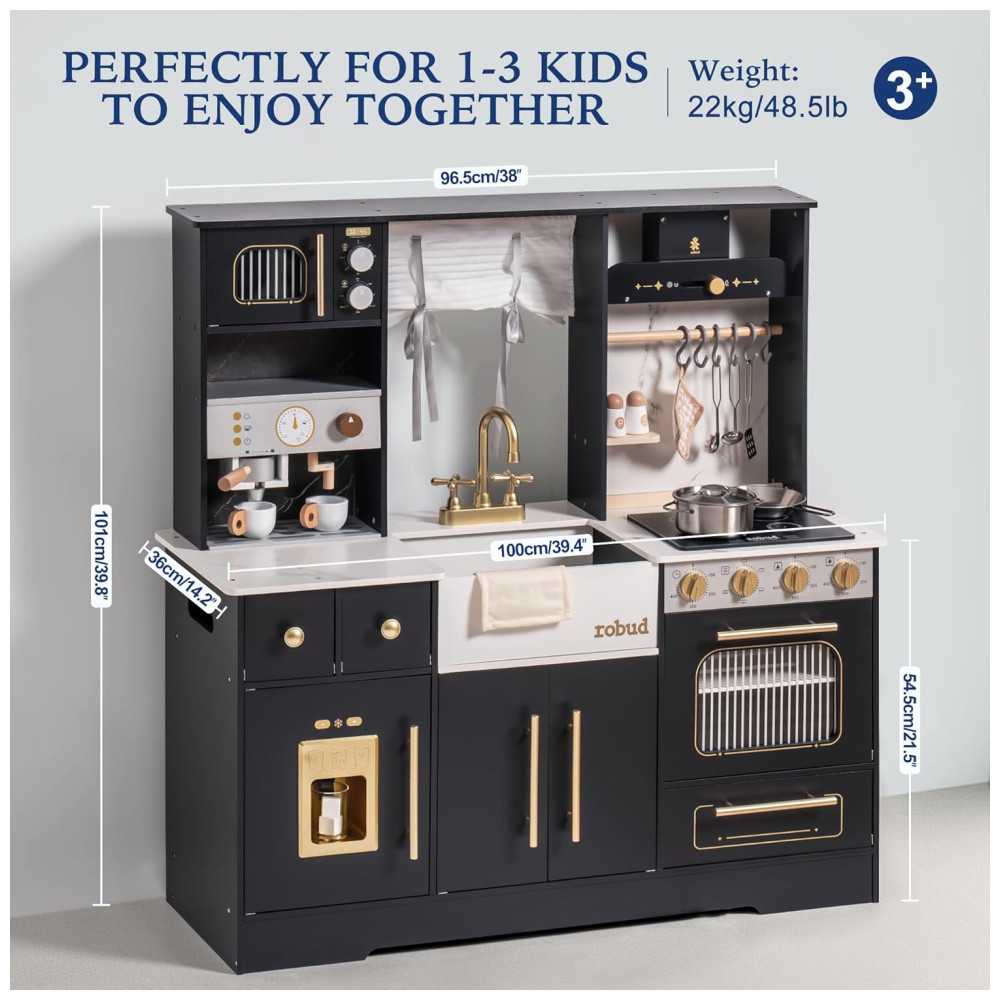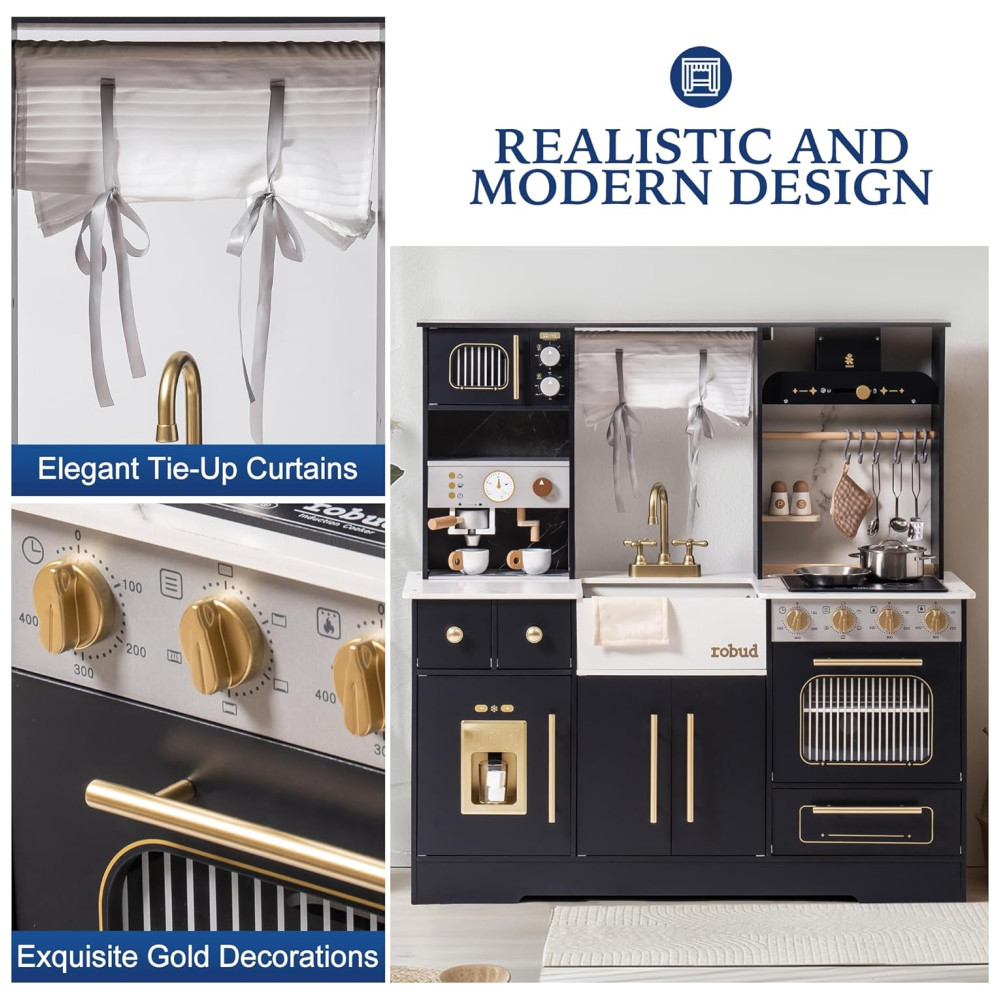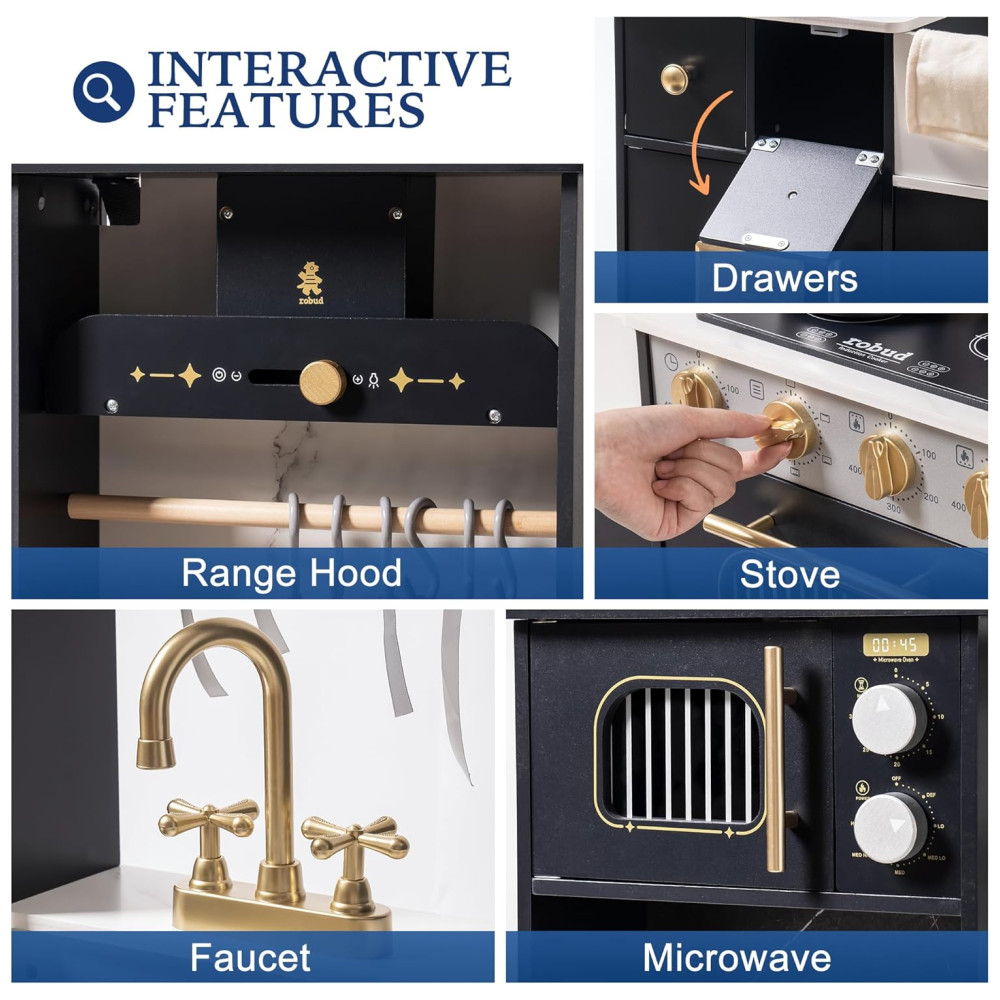 DESIGN REALISTA, ESTIMULA A CRIATIVIDADE: A Cozinha de Brinquedo ROBUD Black Gold Deluxe possui um design requintado com detalhes como uma torneira real, cafeteira, forno e utensílios, proporcionando a experiência de brincar na cozinha mais realista para estimular a criatividade e a imaginação da criança. MATERIAIS SEGUR0S, QUALIDADE GARANTIDA: Feita com materiais de alta qualidade e ecológicos, a superfície é lisa e sem cheiro, com bordas arredondadas para garantir a segurança da criança durante a brincadeira. FUNCIONALIDADES RICAS, MÚLTIPLAS FORMAS DE BRINCAR: Com elementos interativos como botões giratórios, porta do forno que abre e fecha e uma torneira funcional, este conjunto simula operações de cozinha reais, tornando o tempo de brincadeira mais divertido e educacional, enquanto as crianças aprendem habilidades valiosas para a vida. VISUAL ELEGANTE, ATENÇÃO AOS DETALHES: Com um corpo preto elegante com detalhes em dourado, este conjunto estiloso se encaixa perfeitamente em qualquer ambiente. Detalhes como a cafeteira, cortinas, exaustor e armários de armazenamento realçam a sensação de luxo, proporcionando à criança uma cozinha de brincar única. FÁCIL DE MONTAR, SIMPLES DE USAR: Equipado com um manual de instruções detalhado e todas as ferramentas de instalação necessárias, os pais podem montar facilmente este conjunto. Adequado para crianças a partir de 3 anos, é fácil para as crianças começarem e aproveitarem horas de diversão.