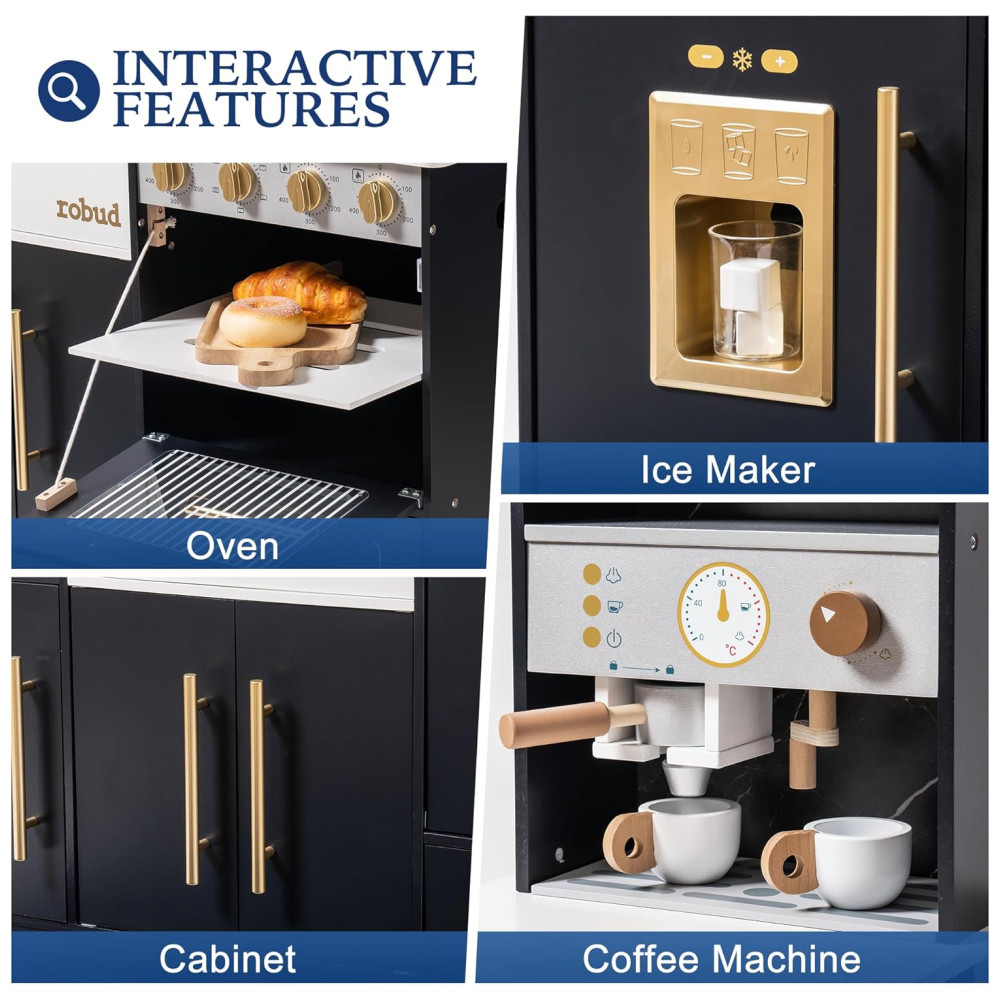 Mini Cozinha Educativa ROBUD para Crianças Brinquedo de Madeira com Máquina de Gelo Cafeteira e Forno Conjunto Realista de Brincar