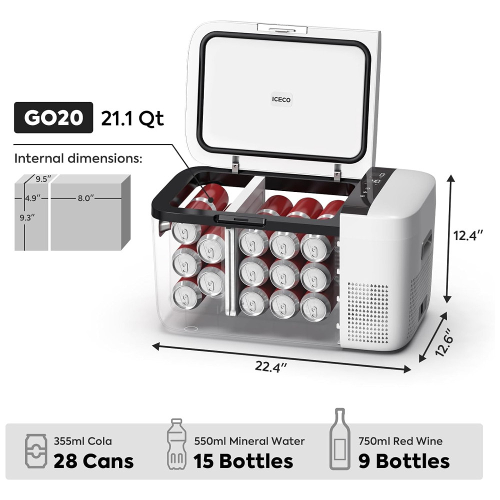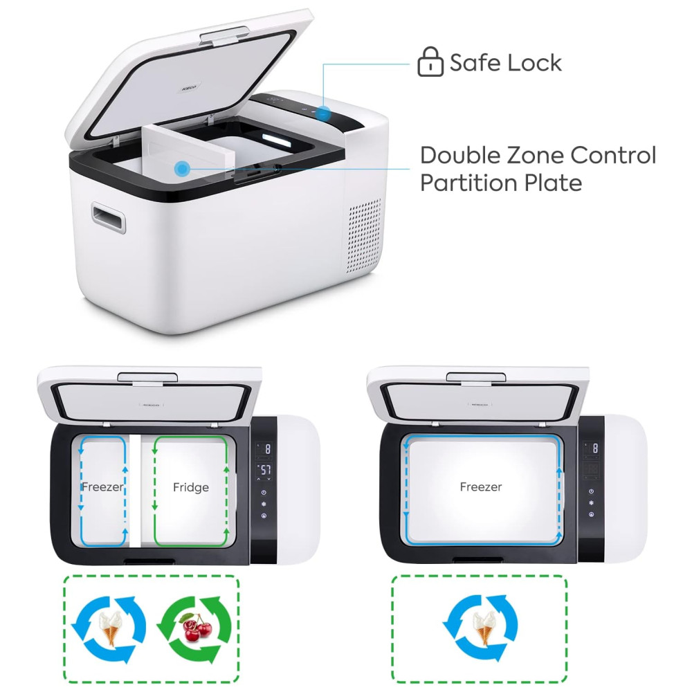 PROJETO DE DUPLA ZONA FLEXÍVEL Com design de partição destacável, GO20 oferece 2 zonas separadas para refrigeração e congelamento, que podem ser operadas com 2 painéis digitais ao mesmo tempo. Você também pode remover a partição e será um espaço completo dentro.