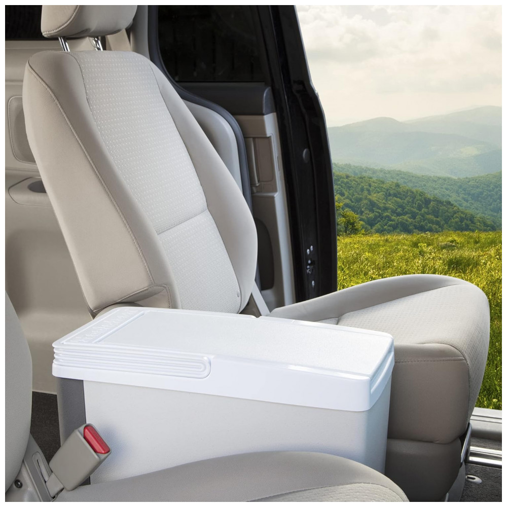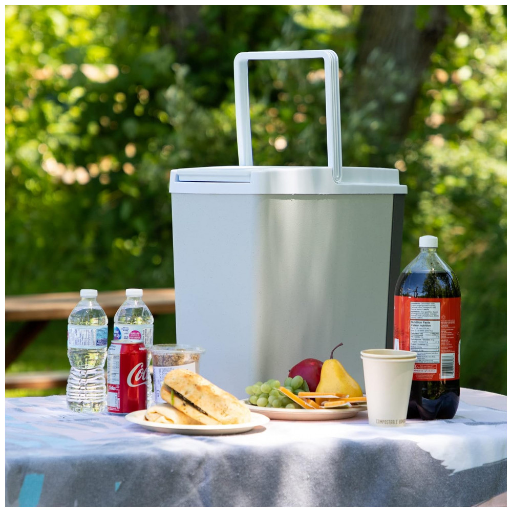 EFRIGERADOR DE VIAGEM COM ECONOMIA DE ESPAÇO Capacidade de 17 L, 18 Quart O refrigerador alimentado por 12 V DC comporta até 23 latas padrão de 355 mL e cabe facilmente em espaços estreitos em seu veículo ou barra