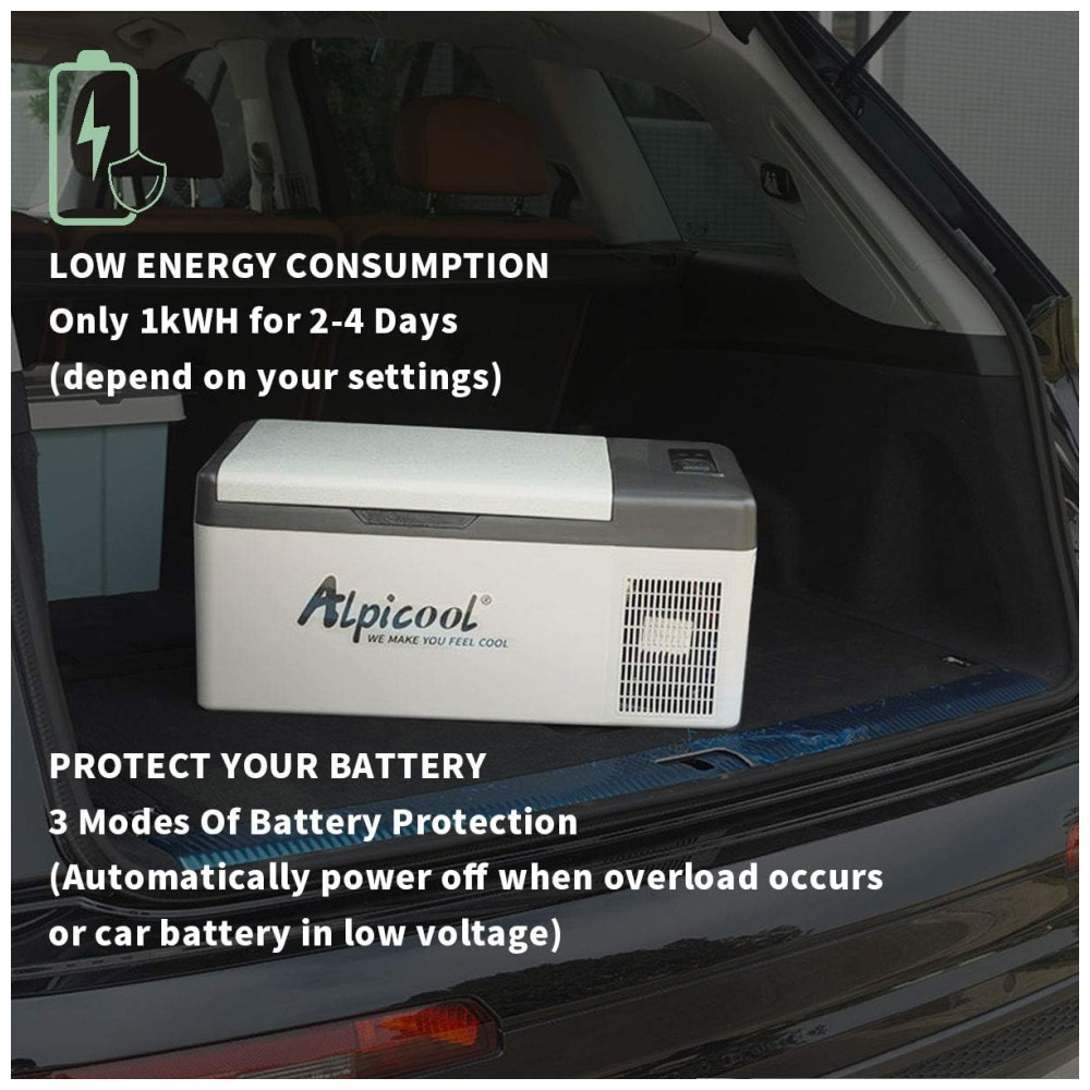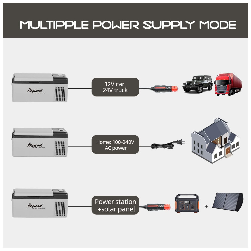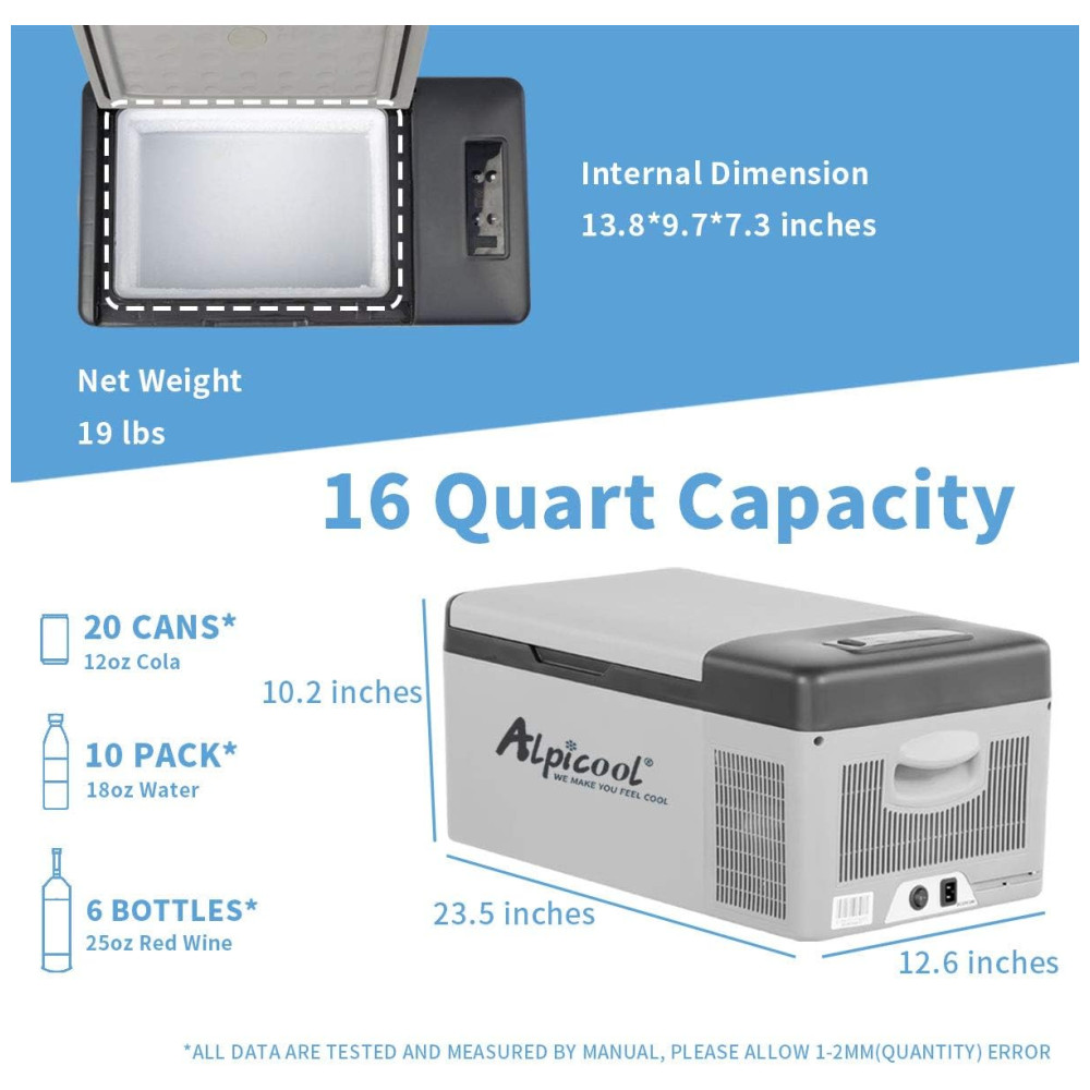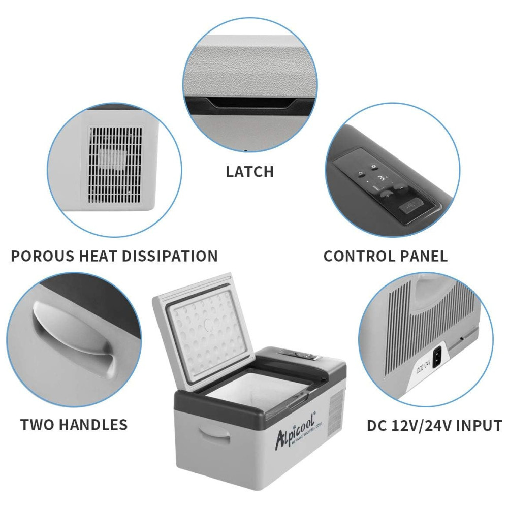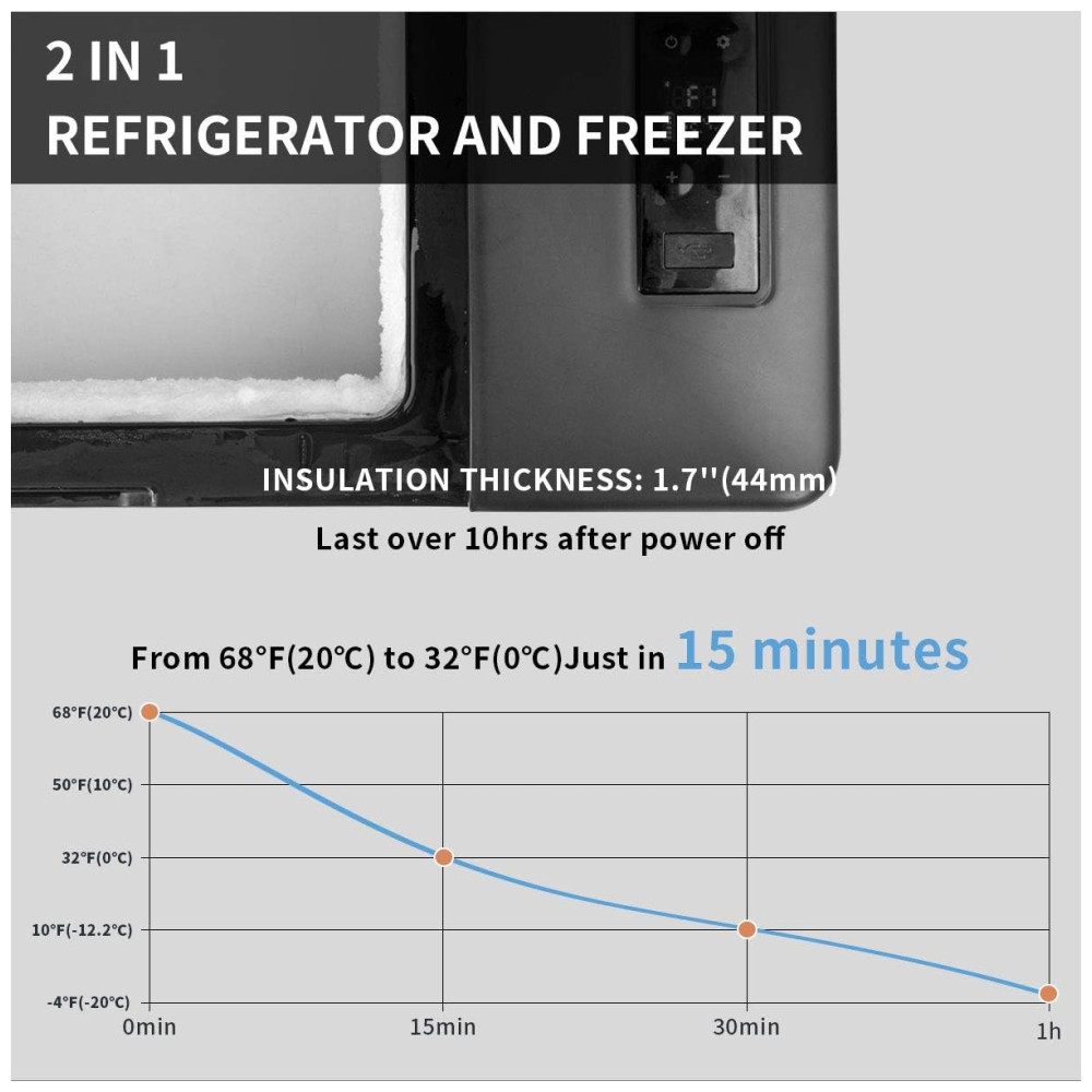 CONGELADORES SEM GELO 20 C de desempenho de resfriamento profundo, pode ser uma geladeira e um freezer. ESPAÇO DE ZENAMENTO Tamanho exterior capacidade de 57 x 32 x 26cm, 15 litros, cabe 20 latas. USO NO CARRO E EM CASA Inclui 2 cabos de alimentação para conectar se separadamente em 12V e Entradas de energia de 24V DC e 110V a 240V CA. Funciona muito bem com seu pequeno sistema solar também. MATERIAL PLÁSTICO FORTE Leve, mas durável e fácil de transportar para qualquer lugar. Isolamento de espuma de alta densidade. Continua a manter o desempenho de refrigeração durante a sua jornada. Fresco e economia de energia super
