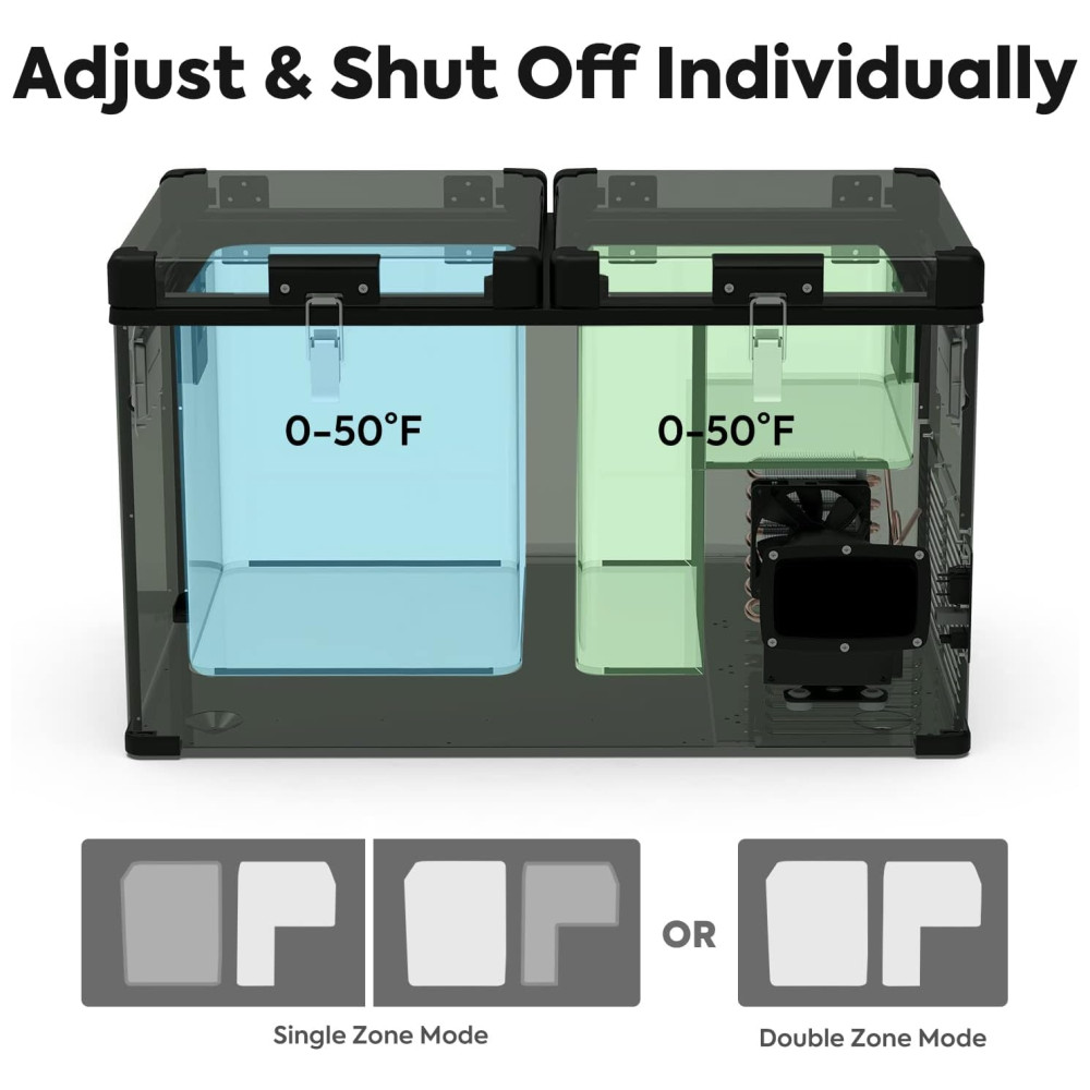 GRANDE CAPACIDADE E PROJETO DE ZONA DUPLA 355ml Capacidade, compartimento de resfriamento de zona dupla. Você pode definir a mesma temperatura para o freezer em ambos os lados ou definir para ser mais frio do que o outro. Além disso, você pode optar por desligar uma zona para fins de economia de energia ou requisitos de capacidade