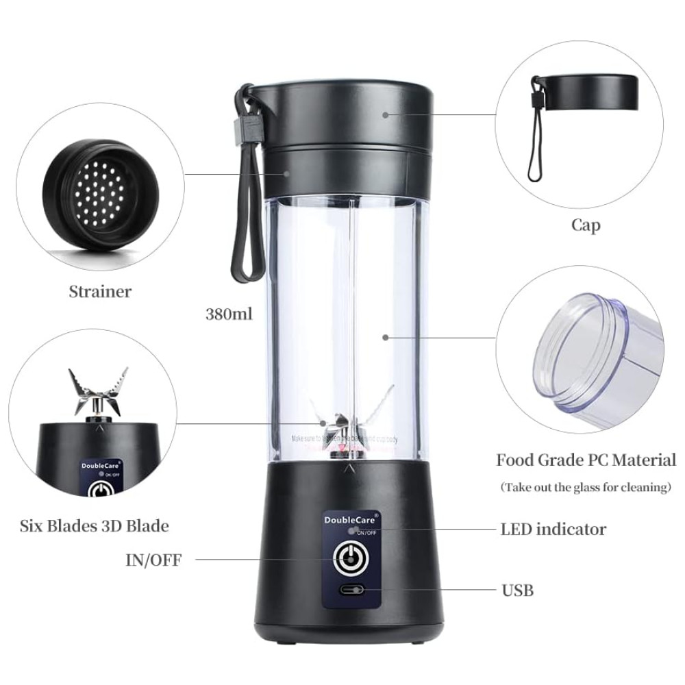 Mini Liquidificador Pessoal Portátil 380mL Recarregável USB com 6 Lâminas 110V DoubleCare Azul