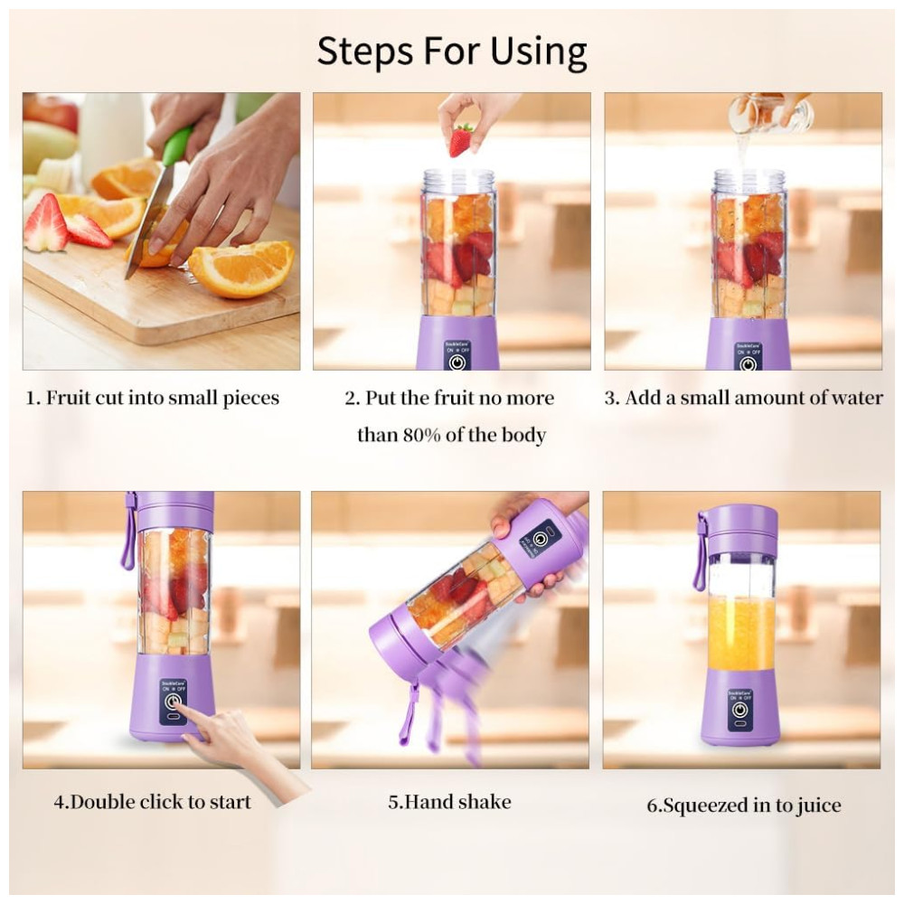 Carregamento USB Seguro de 380ml – O copo liquidificador USB vem equipado com baterias recarregáveis de alta qualidade de 2000mAh, que podem ser recarregadas de várias maneiras, como através de power bank, adaptador AC e computador. O tempo de carregamento é de 3-5 horas; com a carga completa, pode produzir de 10-15 copos de suco.