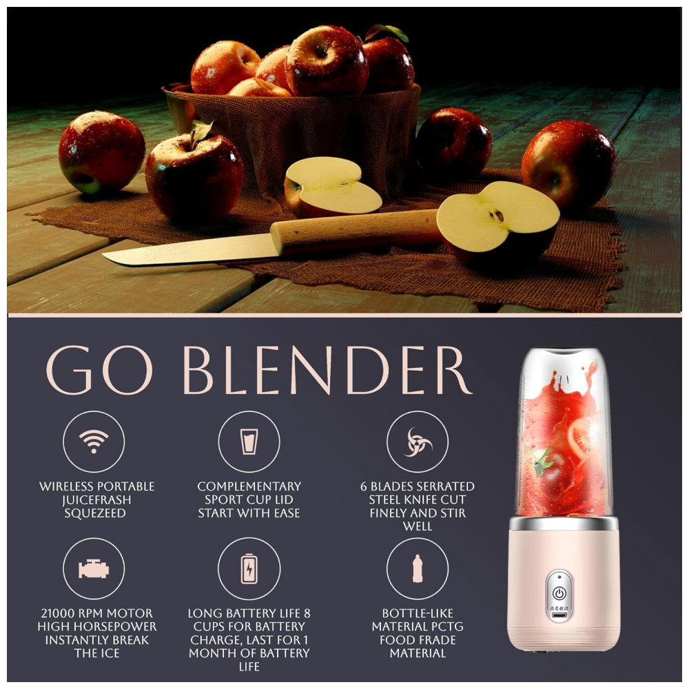 Descrição do Produto: Este mini liquidificador portátil tem capacidade de 400ml, ideal para criar sucos perfeitos e misturar bebidas mais simples. Projetado para ser portátil, inclui um misturador, copo e tampa esportiva. Fácil de manusear e usar, este misturador é alimentado na base.