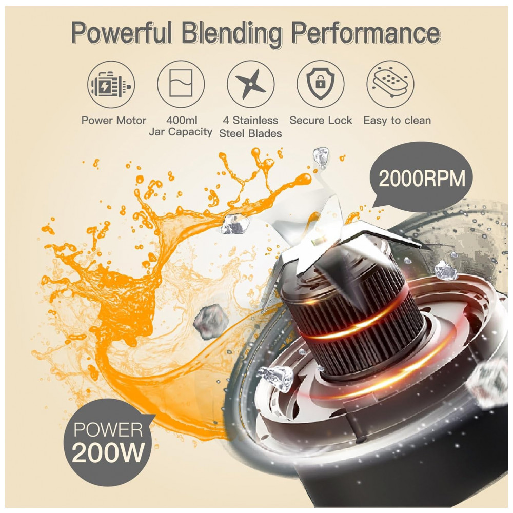 O motor de 200W trabalha em rotação de até cerca de 20.000 rpm, acionando conjunto de 4 lâminas em aço inoxidável, dimensionadas para triturar frutas, vegetais macios e líquidos, produzindo misturas homogêneas em poucos minutos. O acionamento é feito por alavanca, com uma velocidade contínua, permitindo uso simples para preparos rápidos de bebidas e pequenas receitas.