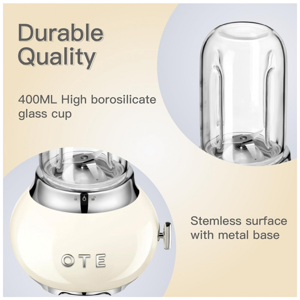 O liquidificador retrô OTE é um modelo pessoal compacto, indicado para preparo de smoothies, shakes, vitaminas e sucos em porções individuais, com design vintage em acabamento verde e corpo em aço inox. Acompanha jarra de vidro de borossilicato com capacidade aproximada de 400 ml, adequada para bebidas de consumo imediato ou porções pequenas na rotina diária.