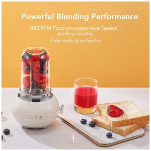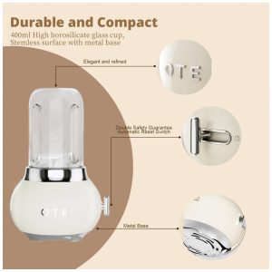 O liquidificador retrô OTE é um modelo pessoal compacto, indicado para preparo de smoothies, shakes, vitaminas e sucos em porções individuais, com design vintage em acabamento verde e corpo em aço inox. Acompanha jarra de vidro de borossilicato com capacidade aproximada de 400 ml, adequada para bebidas de consumo imediato ou porções pequenas na rotina diária.