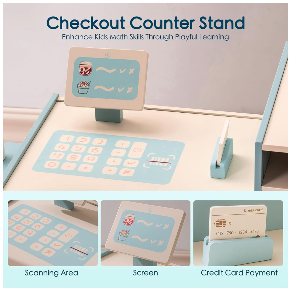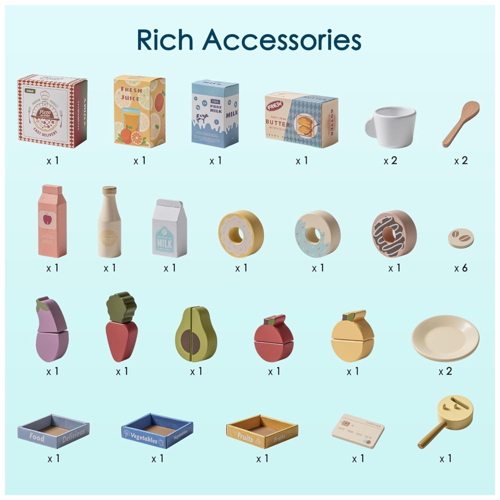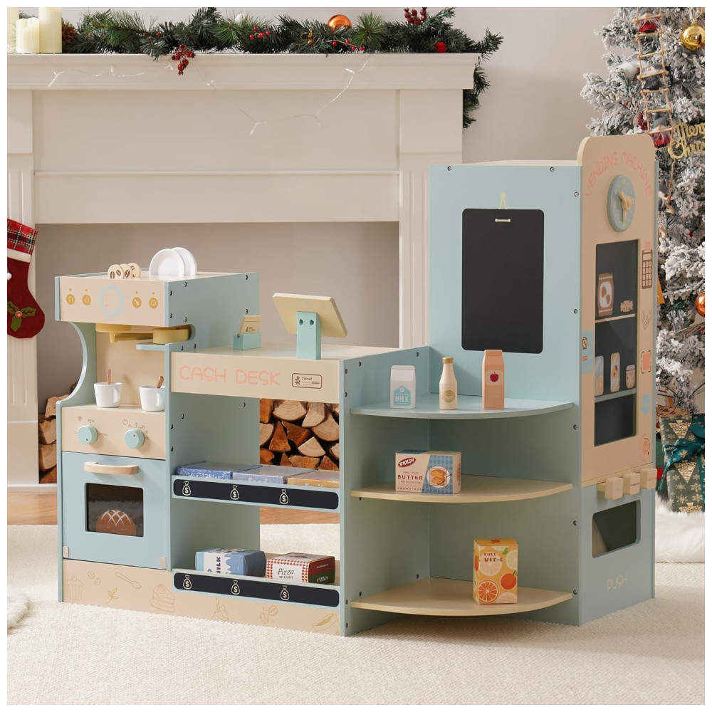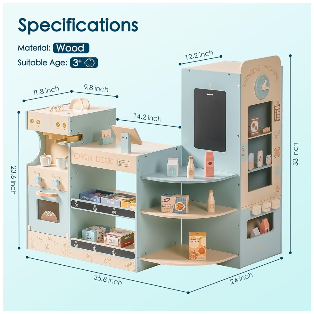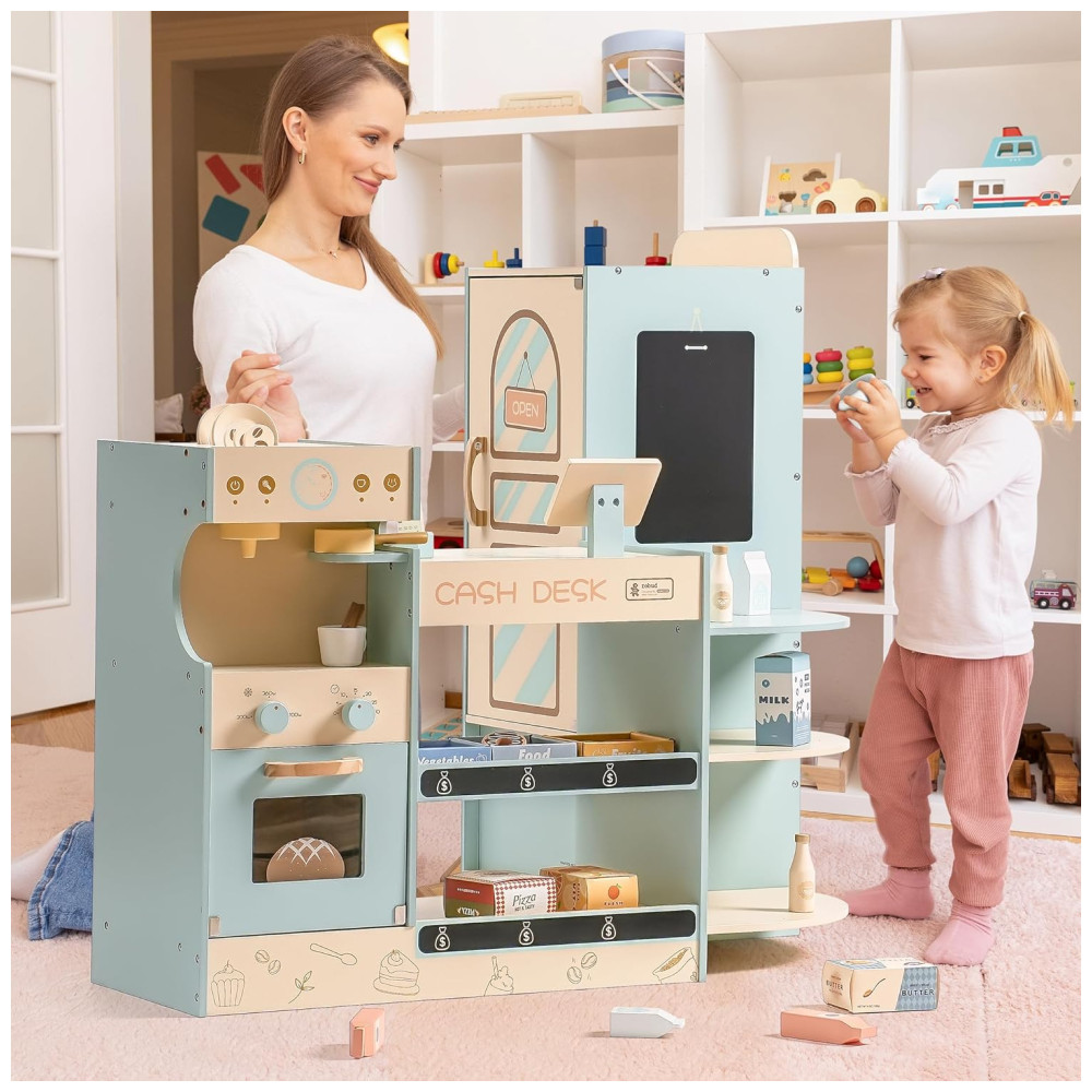 Mini Mercado Educativo de Madeira ROBUD com Caixa Registradora Cafeteira Máquina de Lanches e Forno – Presente Perfeito para Crianças de 3 Anos