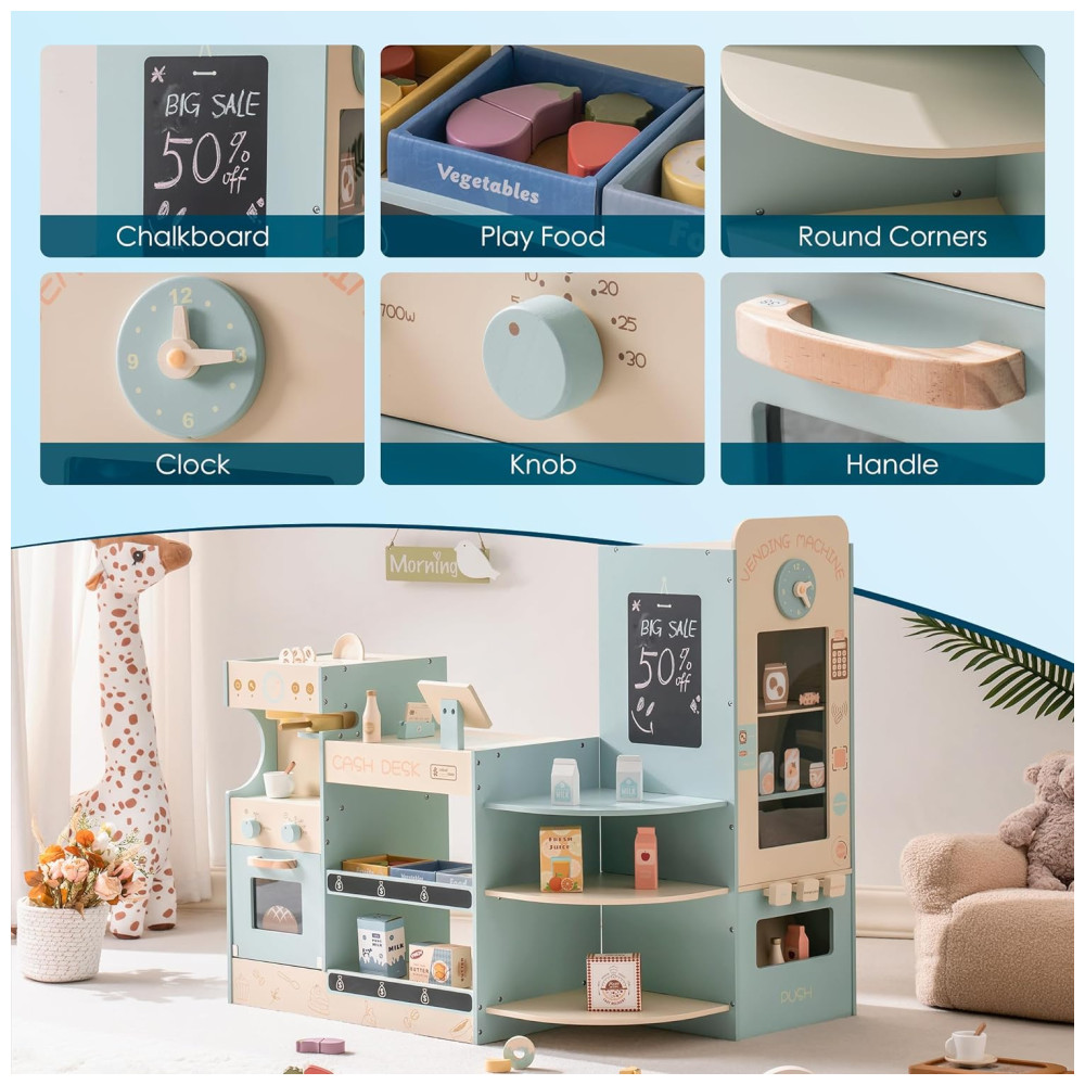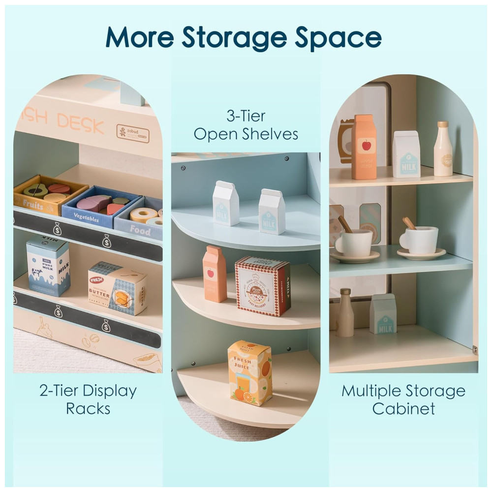 O Mini Mercado ROBUD oferece diversas funções em um único brinquedo: caixa registradora, máquina de café, máquina de vending e forno, além de uma prateleira de exposição. Com um quadro negro para anotar informações de vendas e um relógio para desenvolver a noção de tempo das crianças, estimulando suas habilidades. Feito com materiais premium, cada detalhe é cuidadosamente trabalhado para garantir durabilidade e satisfação. As crianças vivenciam a experiência de serem caixas, clientes ou gerentes de prateleira, estimulando a comunicação e compartilhando com amigos. Este brinquedo promove o desenvolvimento de habilidades sociais, pensamento lógico e trabalho em equipe, abrindo um mundo de imaginação e crescimento. De montagem fácil, o Mini Mercado ROBUD é um presente empolgante e educativo para aniversários, Natal e outras ocasiões, trazendo alegria e aprendizado para as crianças.