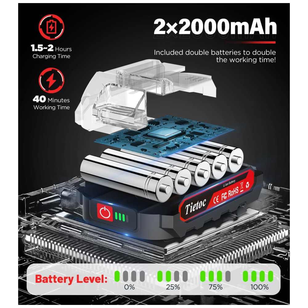 Com a mini motosserra de 6 polegadas Tietoc, você terá um poder de corte incrível à sua disposição Equipada com um motor de alta potência de 880 watts e sistema de lubrificação automática da corrente de aço manganês, você pode cortar galhos de até 15 cm sem esforço, e peças mais grossas de madeira com facilidade. Esta mini motosserra sem fio é perfeita para poda de árvores e jardinagem em acampamentos, economizando dinheiro com o trabalho que você mesmo pode fazer em casa. Com apenas 1,63 quilos de peso, ela é leve e fácil de manusear, sendo amigável para idosos, mulheres e pacientes com artrite. Além disso, ela possui um sistema de lubrificação automática da corrente, permitindo um corte suave, mais cortes e menos uso de energia. Com duas baterias recarregáveis removíveis de 2000mAh, você pode usar a mini motosserra sem fio por muito tempo, sem precisar carregar uma garrafa pesada de óleo lubrificante. A mini motosserra Tietoc é equipada com cinco projetos de segurança, incluindo uma trava de segurança, defletores de segurança para evitar respingos na madeira, luvas anti corte, alça de textura antiderrapante e óculos de proteção. Todos os itens vêm em uma caixa ABS portátil, adequada para trabalho de campo.
