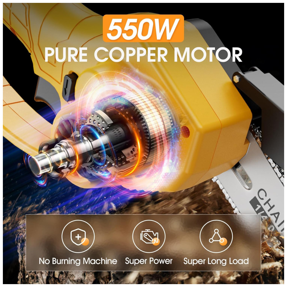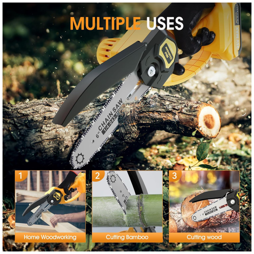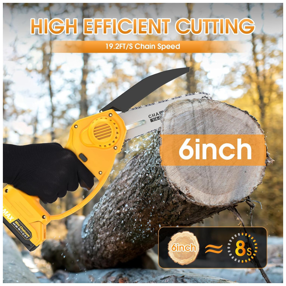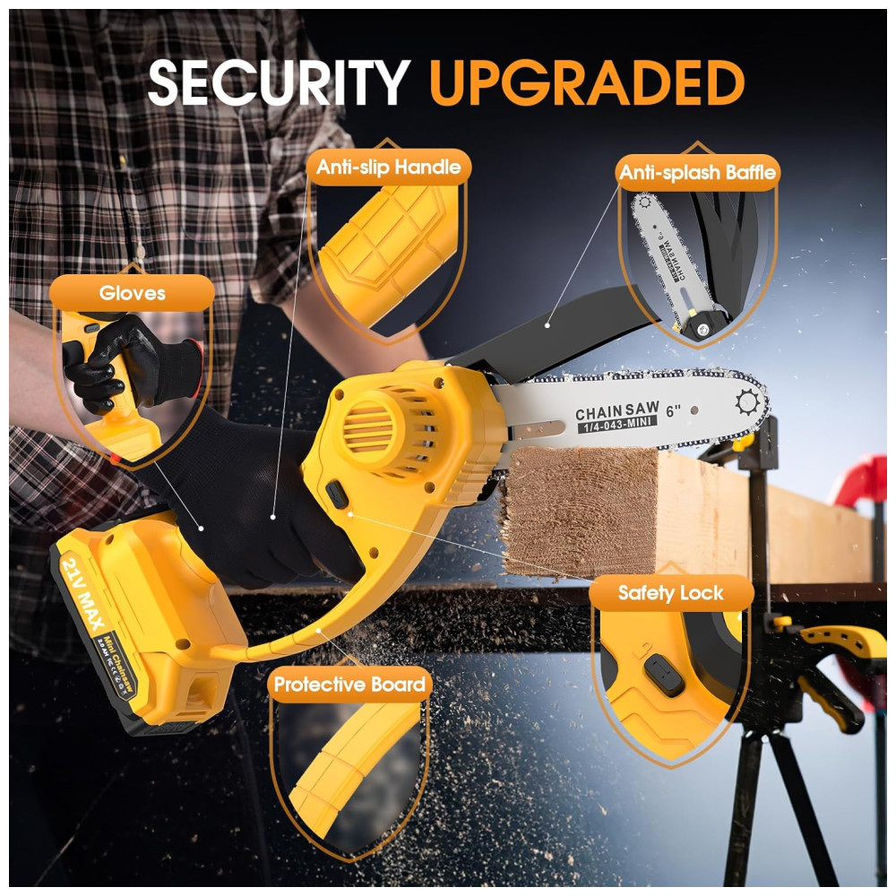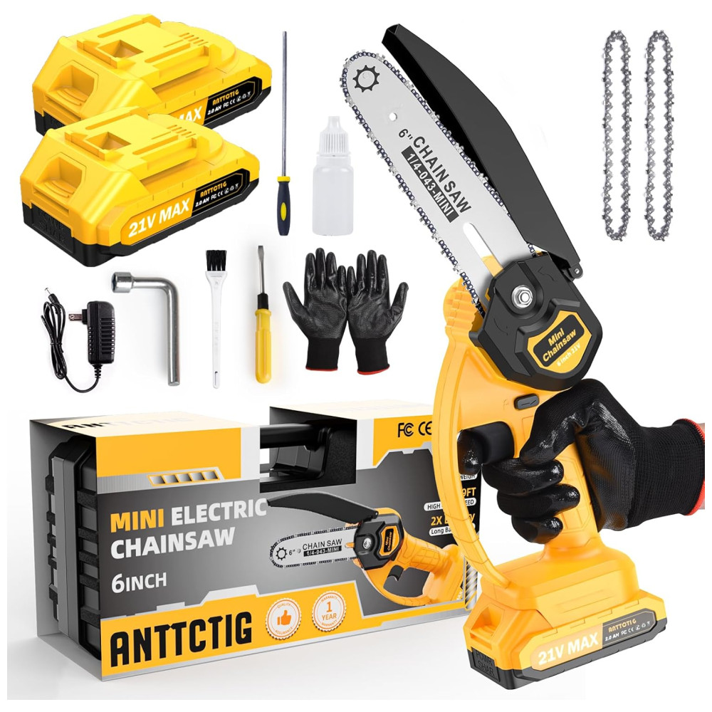 Mini Motosserra Elétrica Portátil para Poda de Galhos com Bateria de 21V e 2 Correntes Anttctig Amarela