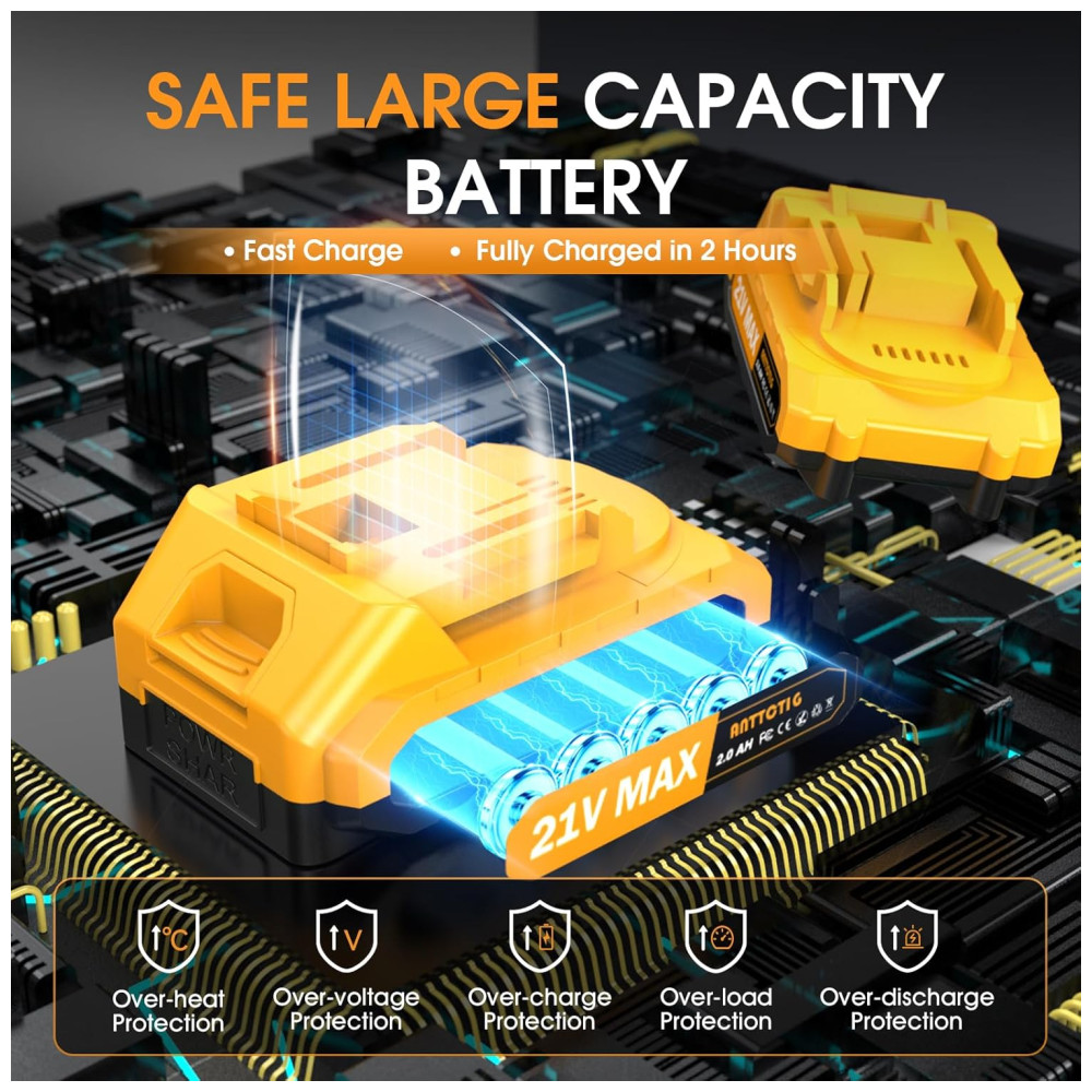 Acompanha 2 baterias recarregáveis de 21V e 2000mAh com certificações internacionais (UL, CE/UL, MSDS, UN 38.3, ROHS), oferecendo proteção contra sobrecarga e aquecimento para maior durabilidade.