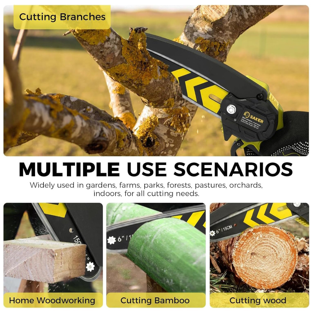 Mini Motosserra Elétrica Portátil para Poda de Galhos Movida a Bateria 20V Saker Amarela