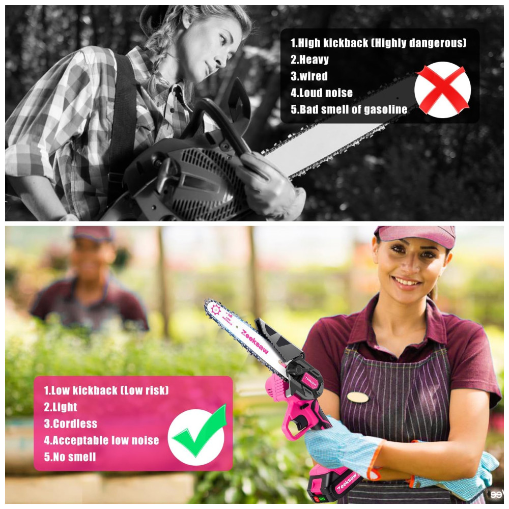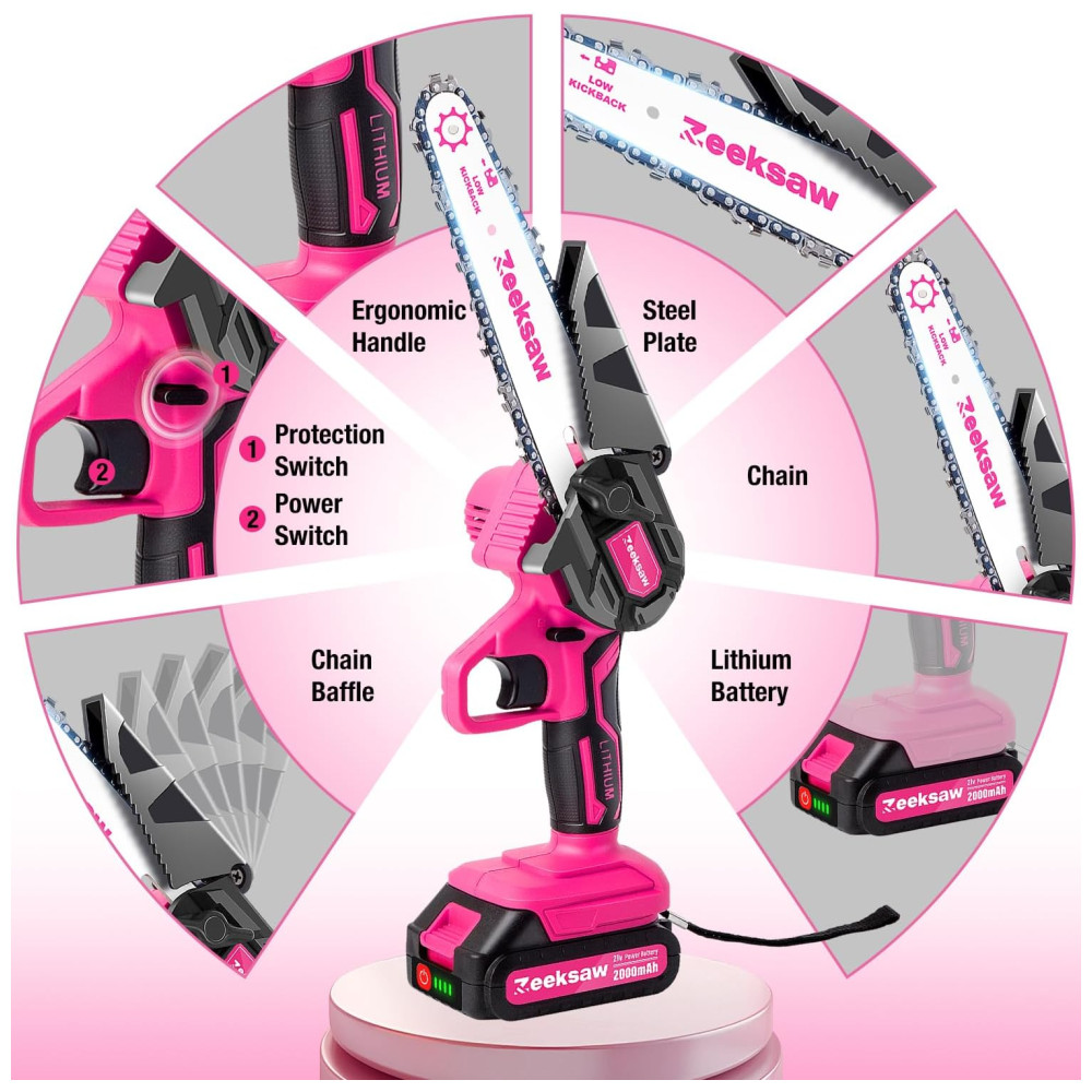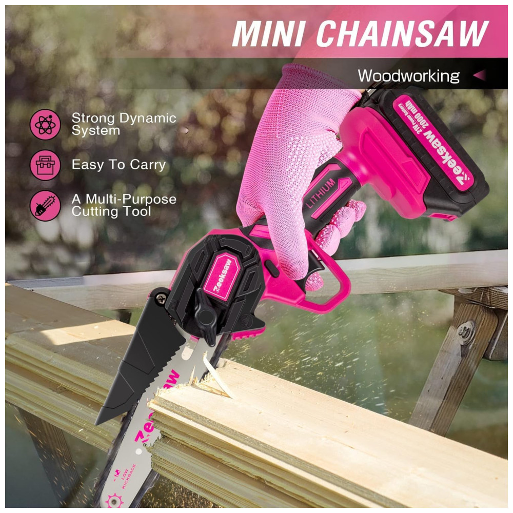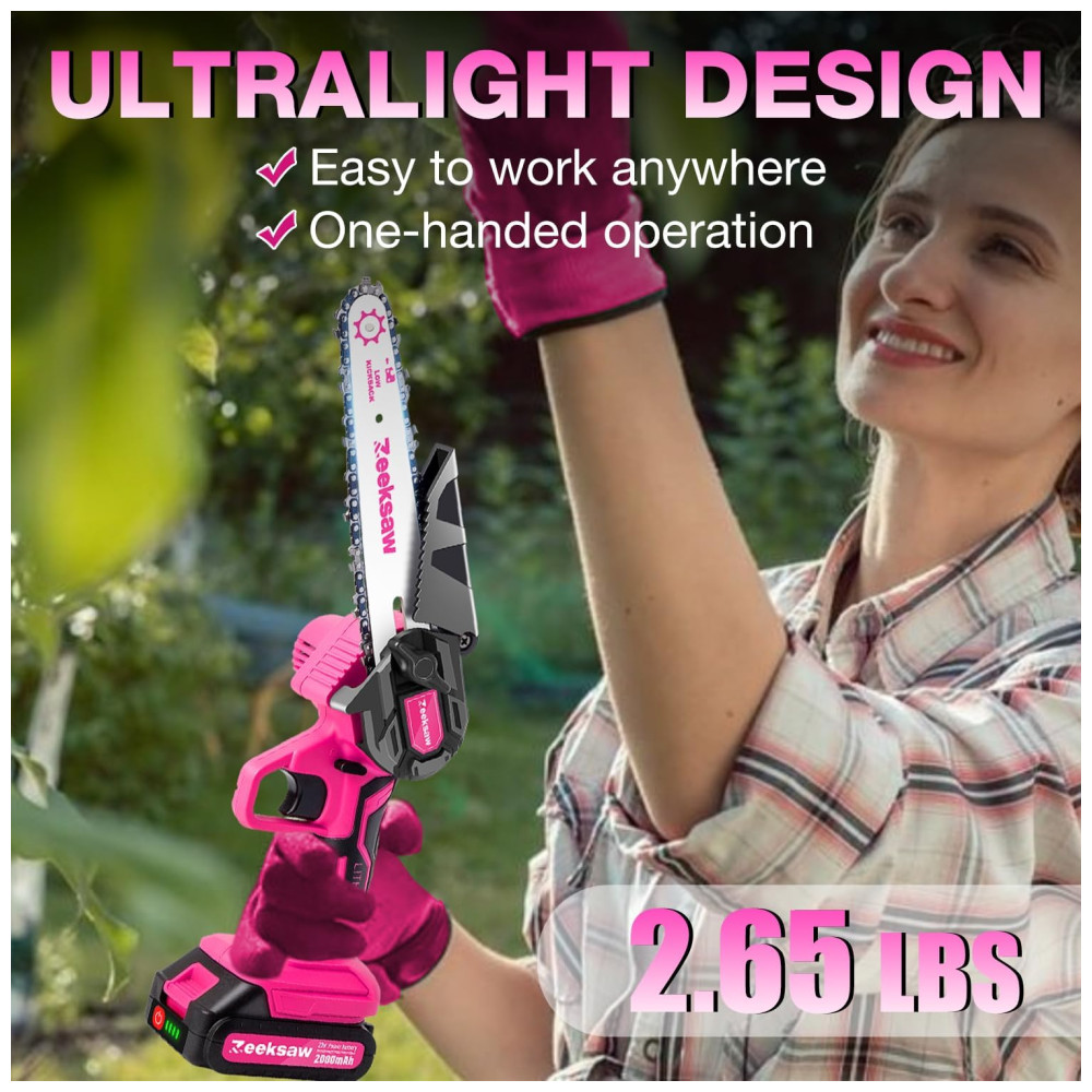 Mini Motosserra Elétrica sem Fio com 2 Baterias 21V para Poda de Galhos 900W Zeeksaw Rosa