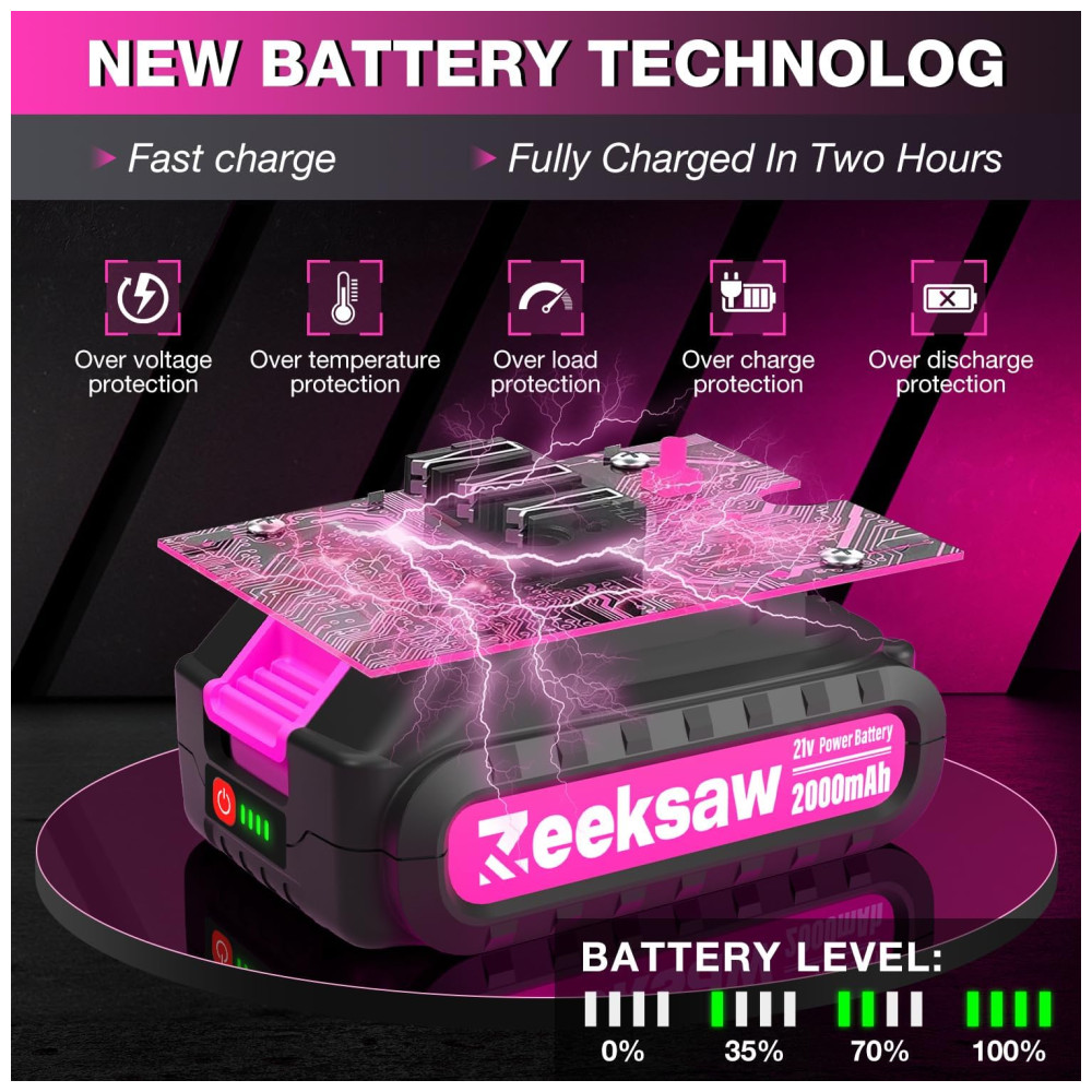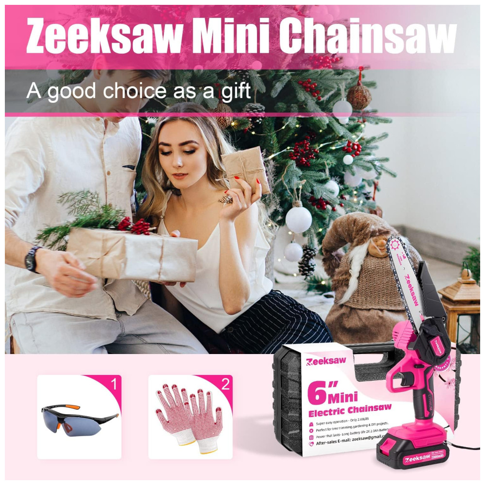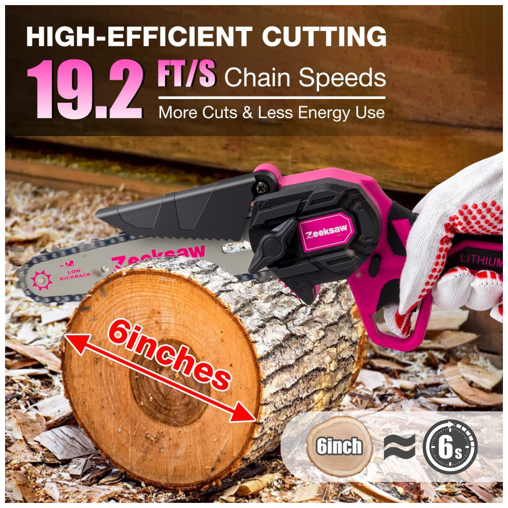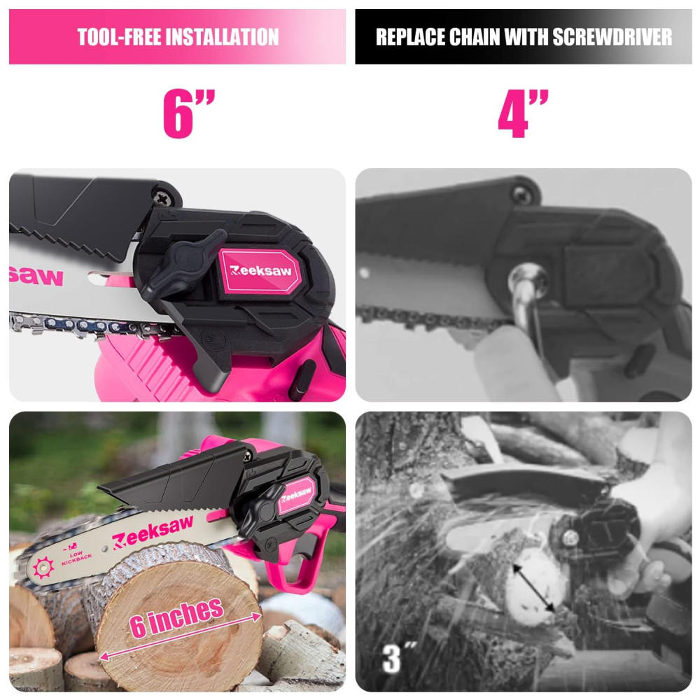 Mini Motosserra Elétrica sem Fio com 2 Baterias 21V para Poda de Galhos 900W Zeeksaw Rosa