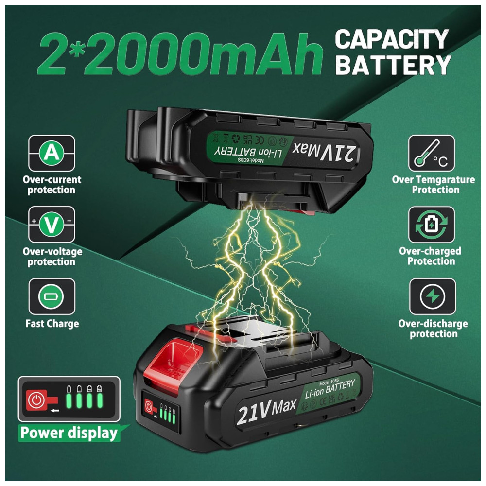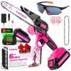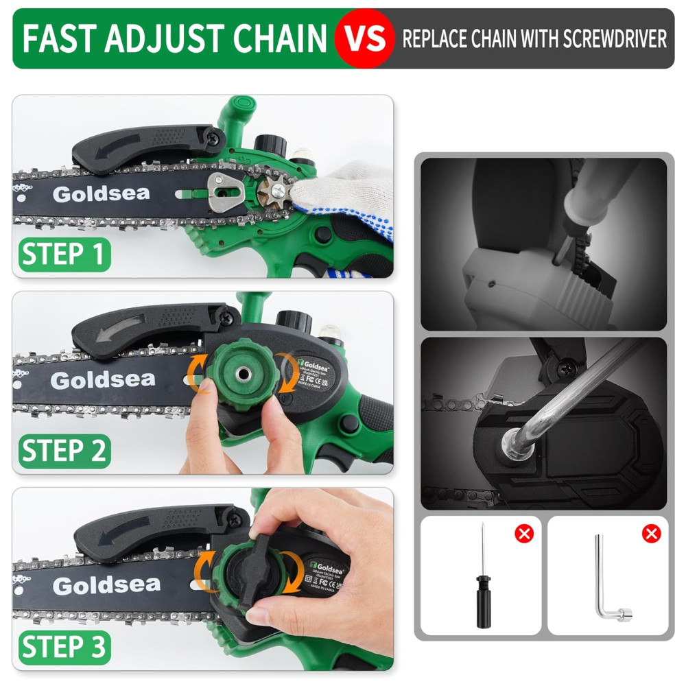 A Mini Motosserra Goldsea é uma motosserra elétrica equipada com um motor potente e duas baterias recarregáveis de lítio de 21 V que fornecem até 50 minutos de tempo de uso. Com um botão aprimorado que facilita a remoção e instalação sem ferramentas da placa guia e da corrente, a motosserra é fácil de usar e pode ser operada por mulheres e idosos. Ela pesa apenas 1,18 quilos e tem um comprimento total de apenas 6 polegadas 15 cm, o que economiza espaço e facilita o transporte.
