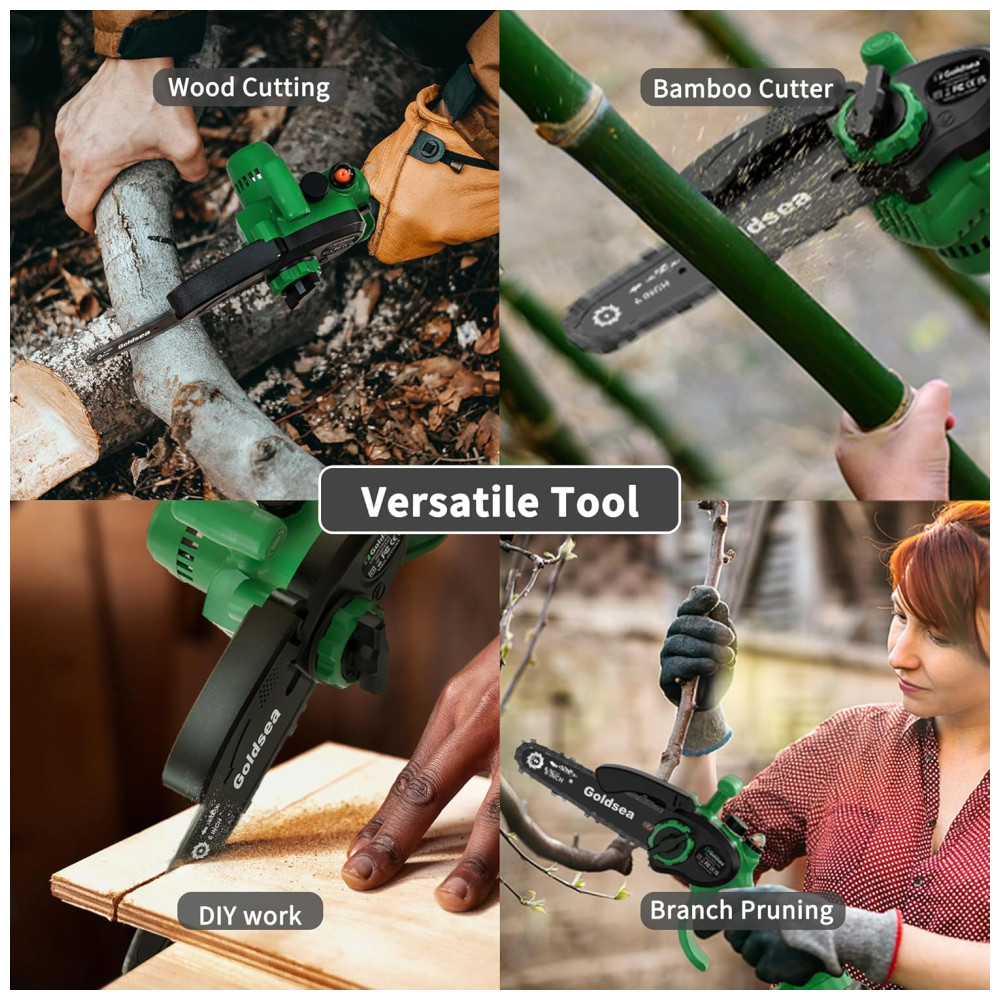 Mini Motosserra Elétrica sem Fio com 2 Baterias Recarregáveis e Correntes de 15cm 800W Goldsea Verde