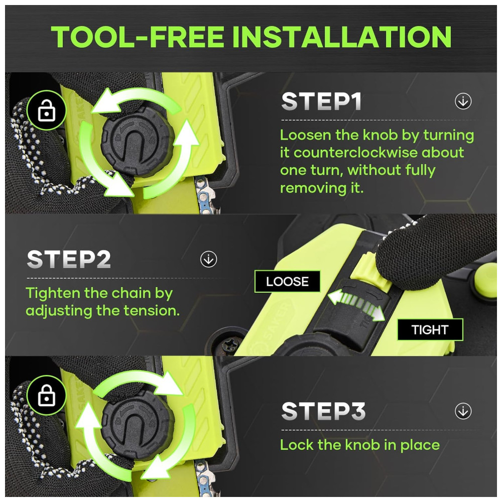Trocar barras e correntes nunca foi tão simples! A mini motosserra Saker permite ajustes sem a necessidade de ferramentas. Com um botão verde para regular a folga da corrente e uma tampa preta giratória para abrir o compartimento, o processo de substituição é intuitivo e prático.