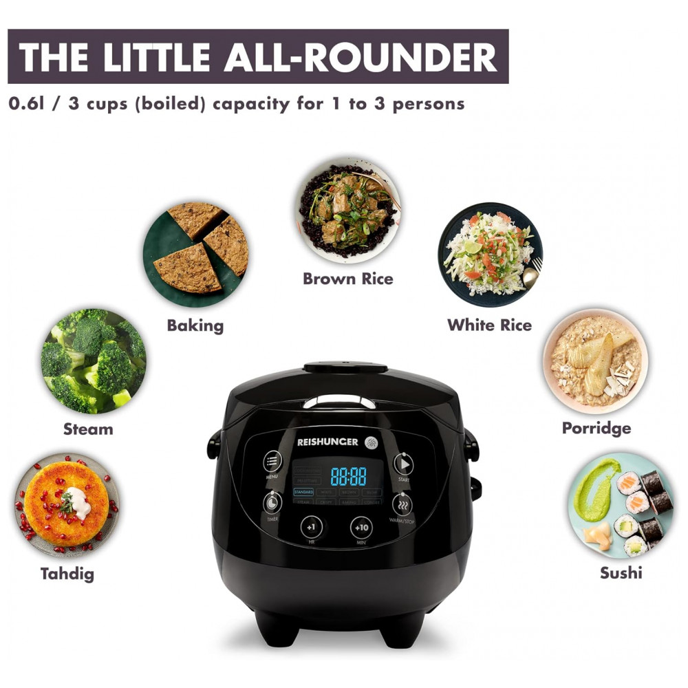 PANELA DE ARROZ PREMIUM DE ALTO DESEMPENHO Acabamento de alta qualidade , longa vida útil , display LED de fácil leitura , contém 0,6 litros para até 3 pessoas , 350 W , 220 V , dimensões 26 x 22 x , peso 3,02 kg , incl. copo de medição, colher de panela de arroz, inserção de vapor , instruções detalhadas