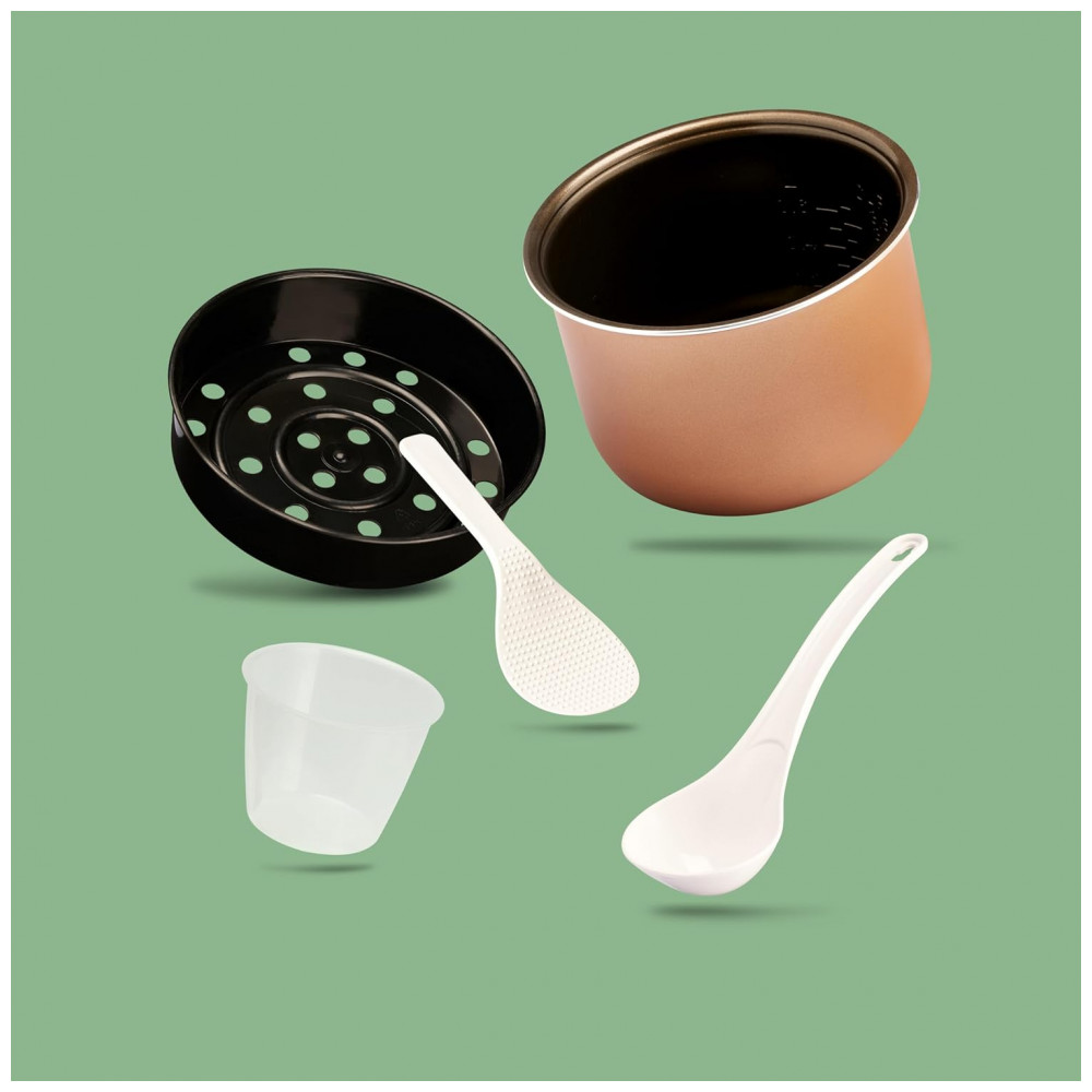 POTE PREMIUM E SEM QUEIMA Panela interna de alta qualidade em aço inox com alças práticas e revestimento duplo em cerâmica antiaderente. Distribuição de calor 3D para arroz cozido no vapor de maneira uniforme e perfeita