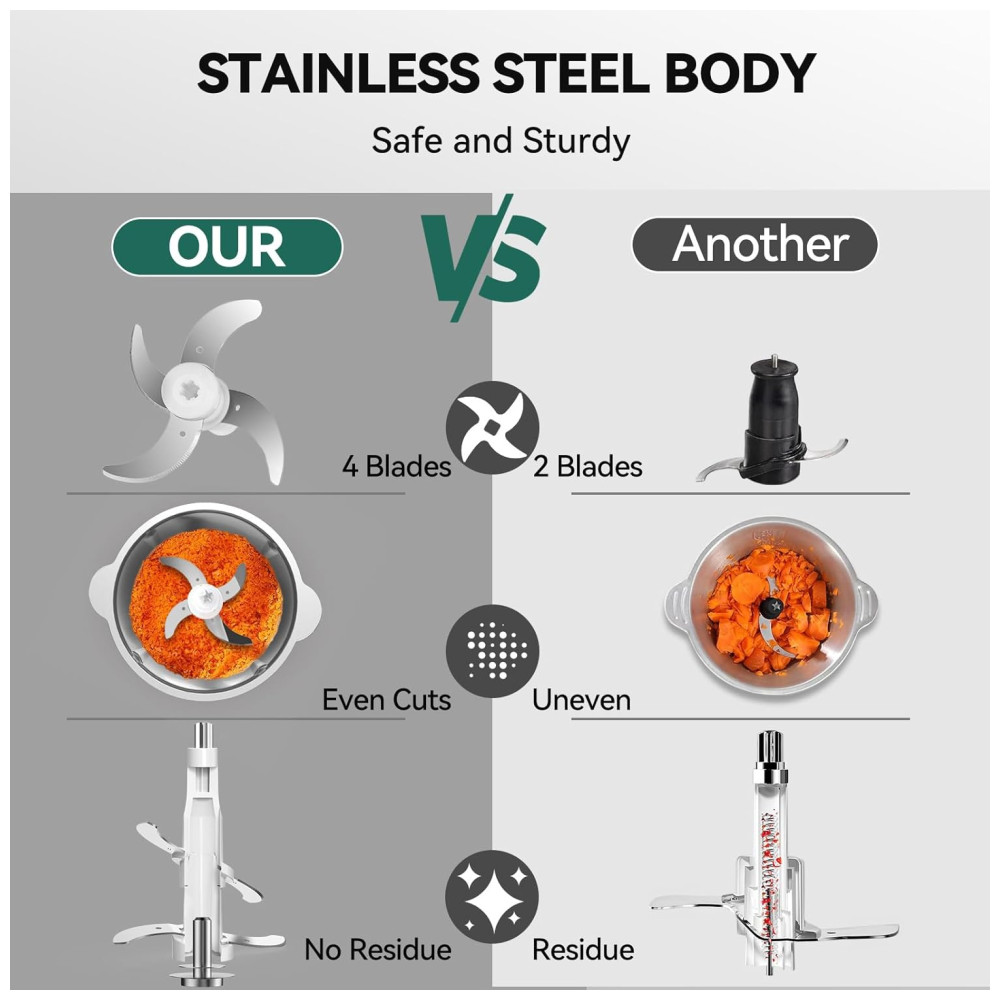 Chopper rápido e eficiente Nosso processador de alimentos usa um motor de cobre puro de 250W, o motor de cobre puro pode trazer velocidade mais rápida e menor temperatura do motor com a mesma potência, lâminas afiadas 4D podem triturar alimentos uniformemente em 360 graus, facilitando o cozimento .