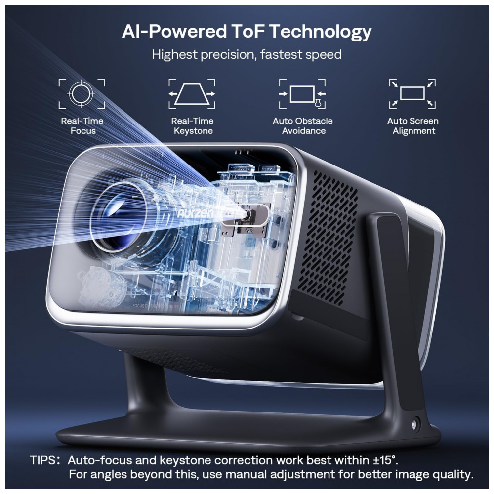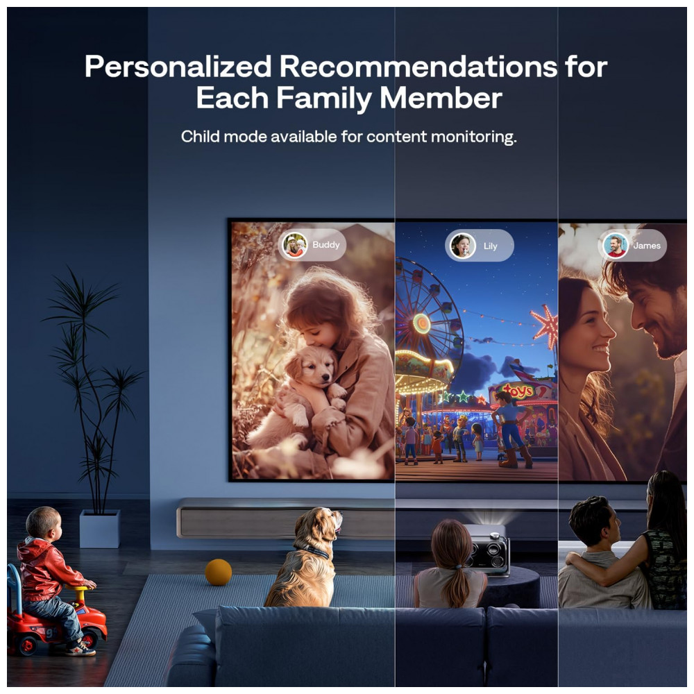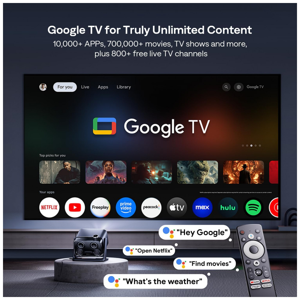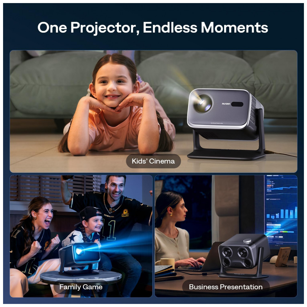 O Mini Projetor Aurzen Boom Mini é um dispositivo portátil com resolução nativa Full HD 1920×1080 pixels e suporte a 4K. Serve para projeção de vídeos em ambientes internos ou externos, compatível com smartphones, tablets, laptops e consoles de jogos via WiFi dual-band, Bluetooth bidirecional, HDMI, USB ou conector 3.5mm. Seus diferenciais incluem sistema Google TV oficial com acesso a mais de 10.000 aplicativos, controle por voz Google Assistant, modo infantil com controle parental e foco/keystone em tempo real por tecnologia ToF.