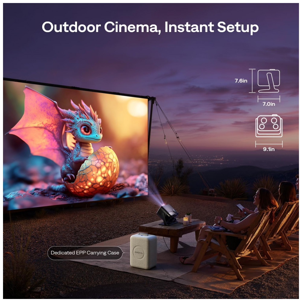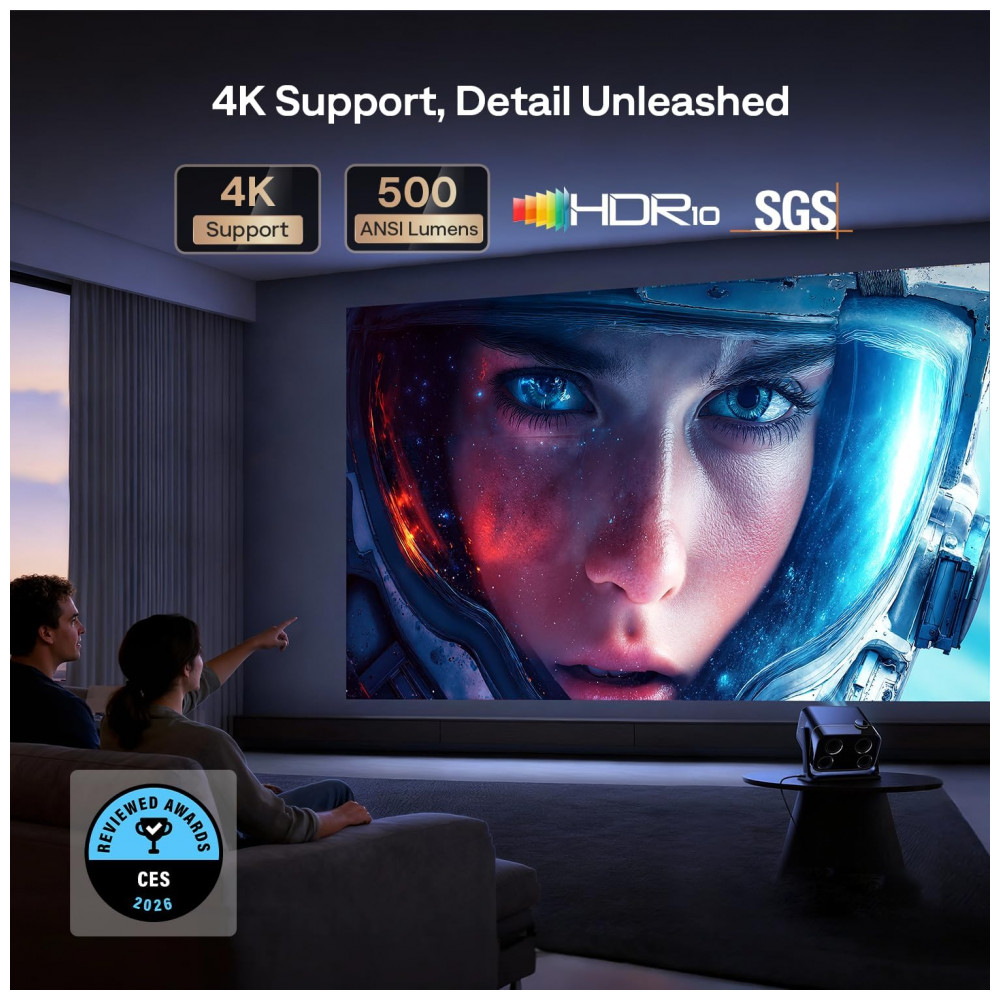 Equipado com alto-falantes 20W Dolby Audio visíveis em 360° e HDR10, gera imagens de 102 cm a 508 cm em distâncias de 1,2 m a 6 m. Mede 23,1 cm x 17,8 cm x 19,3 cm e pesa 2,13 kg, suportando montagem em teto, piso, mesa, tripé ou parede, com certificação SGS de 500 ANSI lúmens e vida útil da lâmpada LED de 30.000 horas.