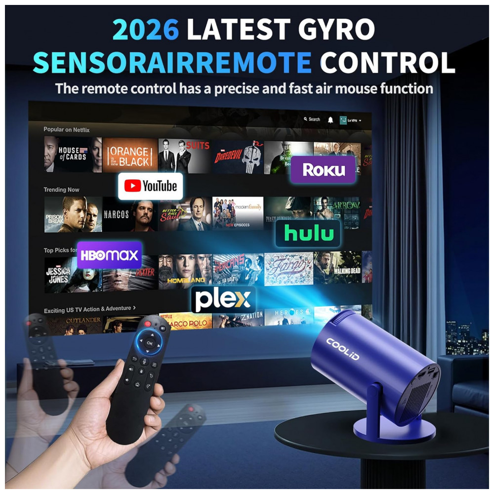 O Mini Projetor coolid C2 é um dispositivo portátil LED com resolução nativa 1920 x 1080 pixels e suporte a decodificação de vídeo 4K HDR, destinado à exibição de imagens em ambientes internos ou externos com pouca luminosidade. Equipado com controle remoto a ar via giroscópio, apps integrados como Prime Video, YouTube e D+, e tecnologias WiFi 6 dual-band (2.4 GHz e 5 GHz) mais Bluetooth 5.4, permite conexão sem fio estável a smartphones, laptops, tablets, consoles de jogos, televisores, fones e caixas de som via HDMI ou USB.