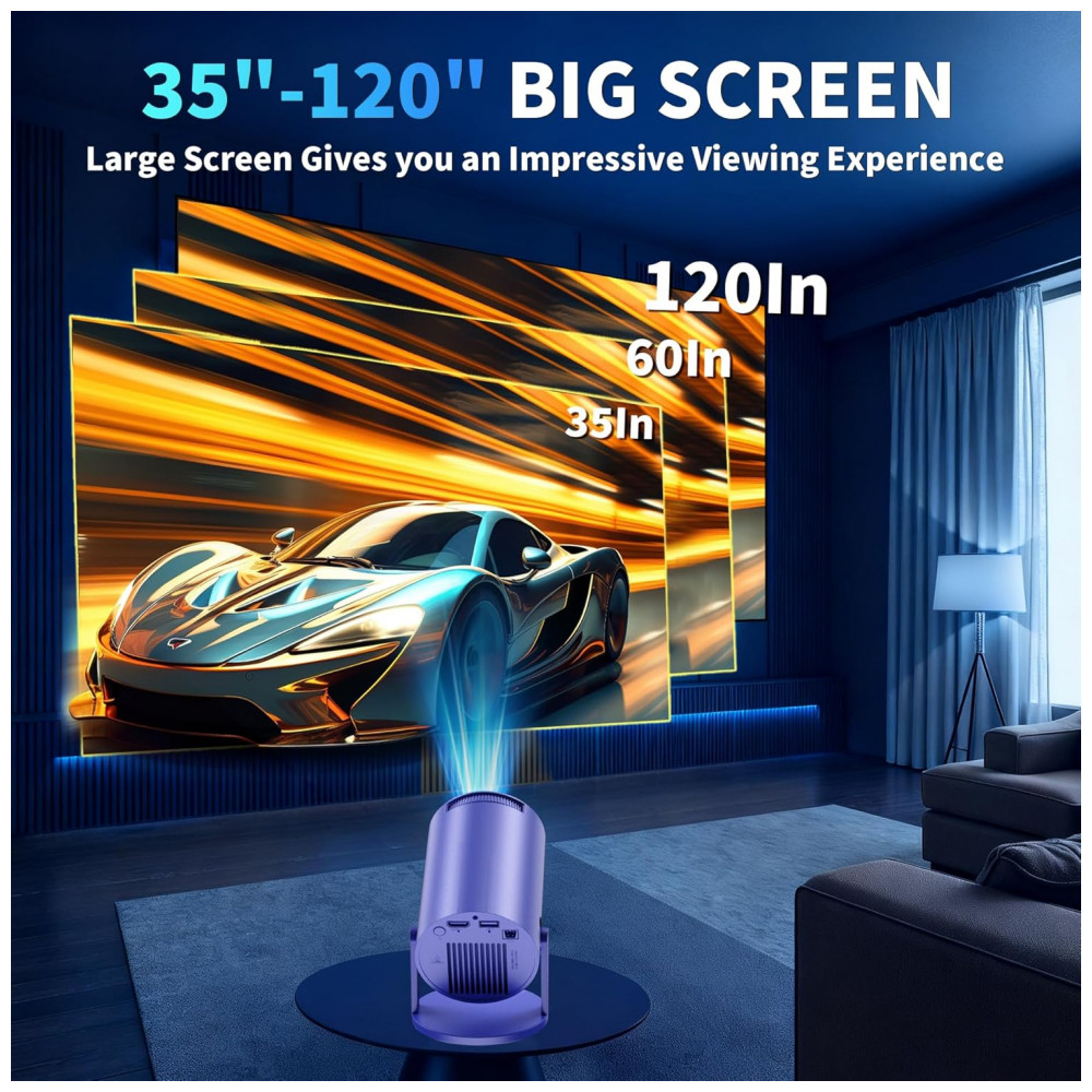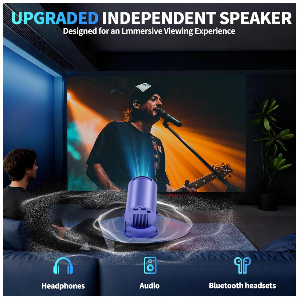 Sua estrutura rotativa de 180° e correção automática de keystone ajustam o ângulo de projeção, com roda de foco e zoom digital de 35% a 100%, suportando proporção de tela 1.3:1 em distâncias de 0,6 m a 2,5 m e tamanhos de imagem de 89 cm a 305 cm de diagonal. O alto-falante integrado e vida útil da fonte de luz de 30.000 horas facilitam uso em home theater doméstico ou portátil. Recomenda-se superfície estável e sinal WiFi estável para desempenho ideal.