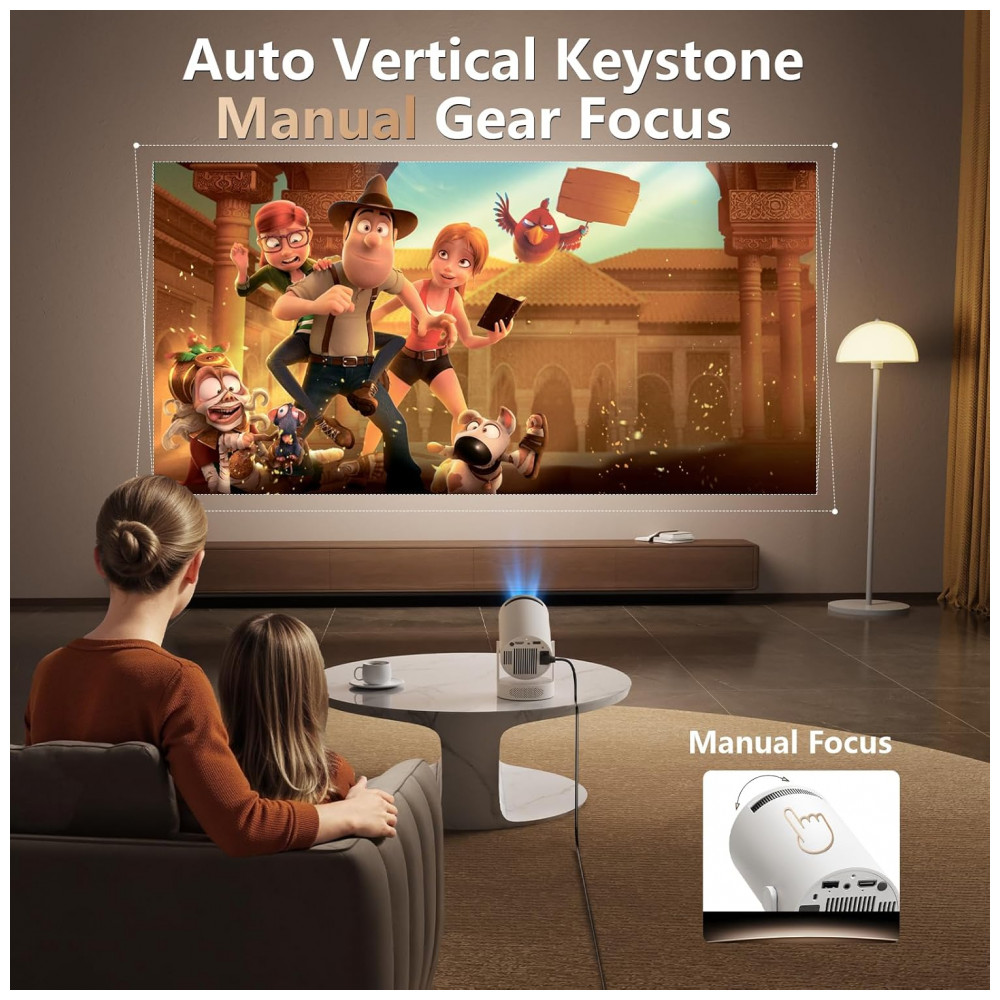Sua base rotativa de 180° facilita projeção em paredes, tetos ou cantos, com correção automática de keystone vertical e foco manual para alinhamento preciso da imagem. O brilho de 220 lúmens ANSI e contraste de 2000:1 suportam tamanhos de imagem de 1,27 m a 3,81 m de diagonal, em distâncias de 0,5 m a 1,6 m. Compatível com laptops, smartphones, tablets e caixas de som via HDMI, USB ou sem fio, inclui alto-falante integrado e recomenda-se sinal WiFi estável para melhor desempenho. Ideal para uso em home cinema doméstico ou espaços compactos.