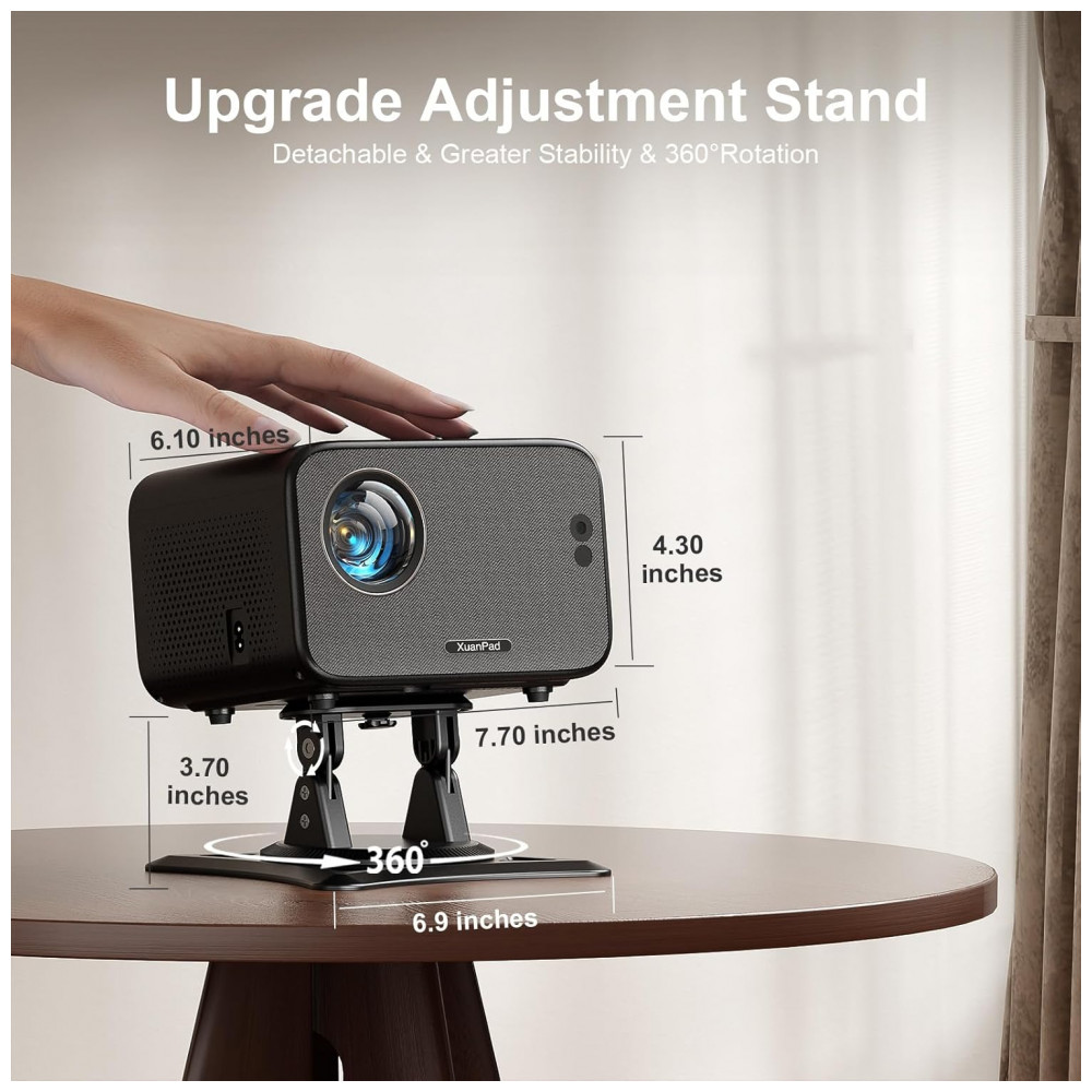 O Mini Projetor XuanPad M10 é um dispositivo de mesa com resolução nativa Full HD 1920×1080 pixels e suporte a 4K. Serve para projeção de vídeos em ambientes internos ou externos, compatível com smartphones, laptops e consoles de jogos via WiFi 6, Bluetooth 5.2 bidirecional, HDMI, USB ou conector AV/3.5mm. Seus diferenciais incluem sistema smart com apps certificados, foco e correção keystone automática por IA em 3 segundos, suporte rotativo 360° horizontal/70° vertical e som estéreo 3D sem necessidade de alto-falantes externos.