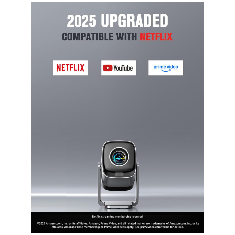 Outros dados técnicos relevantes: WiFi 6, Bluetooth 5.2 bidirecional, foco TOF tempo real, correção keystone 4D/4P automática, obstáculos, suporte rotativo 210°, áudio Dolby Hi-Fi estéreo, 99% sRGB, HDR, zoom 50-100%.