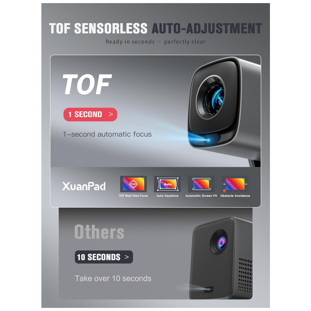 O Mini Projetor XuanPad V18 é um dispositivo portátil com resolução nativa Full HD 1920×1080 pixels e suporte a 4K. Serve para projeção de vídeos em ambientes internos ou externos, compatível com smartphones, laptops, tablets, TVs e consoles de jogos via WiFi 6, Bluetooth 5.2 bidirecional, HDMI, USB ou conector 3.5mm. Seus diferenciais incluem sistema smart compatível com Netflix, foco automático TOF em tempo real, correção keystone 4D/4P automática, obstáculos e suporte rotativo 210° para instalação flexível.
