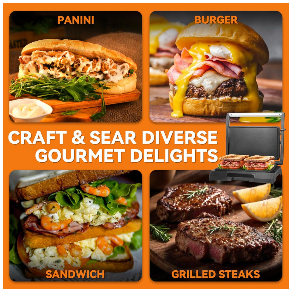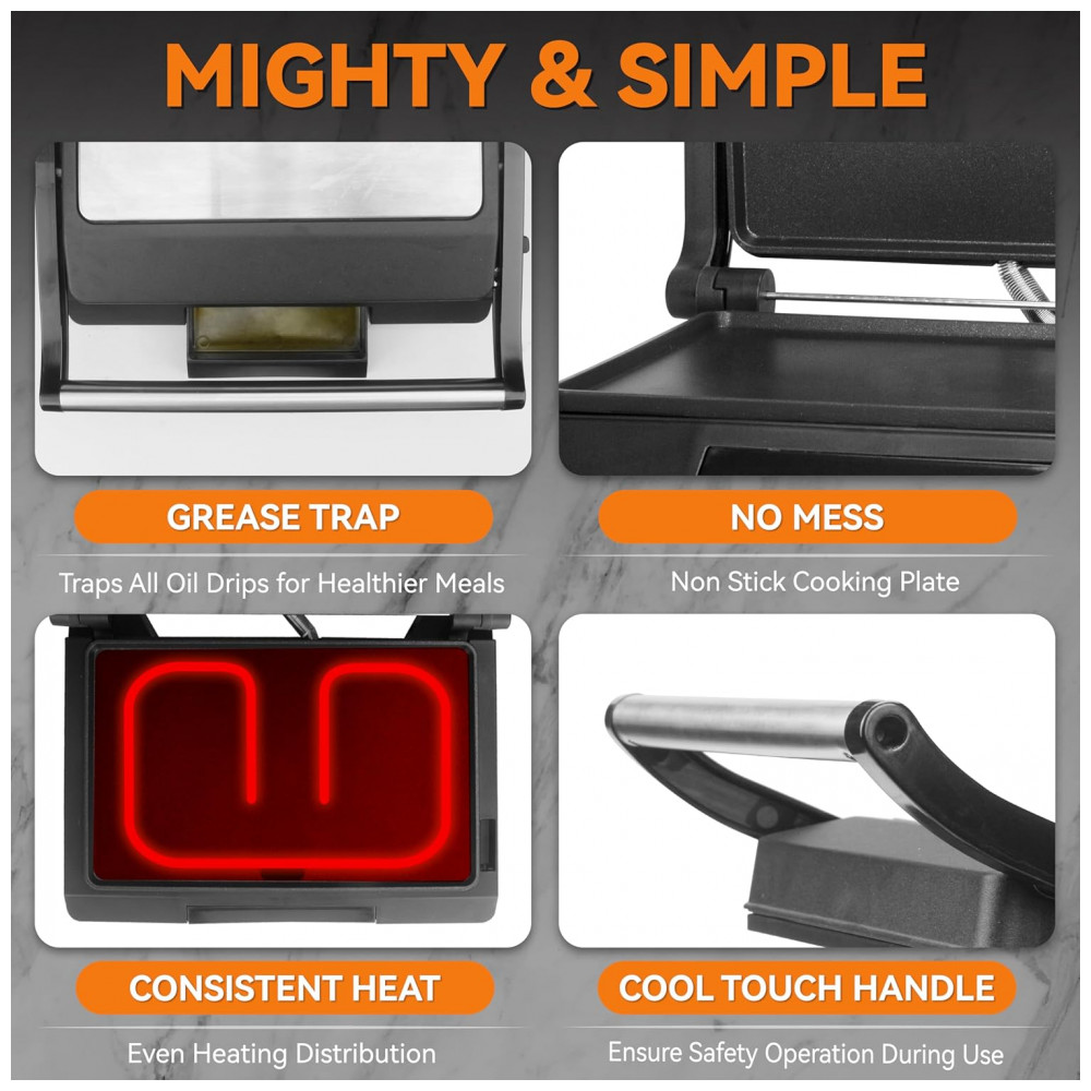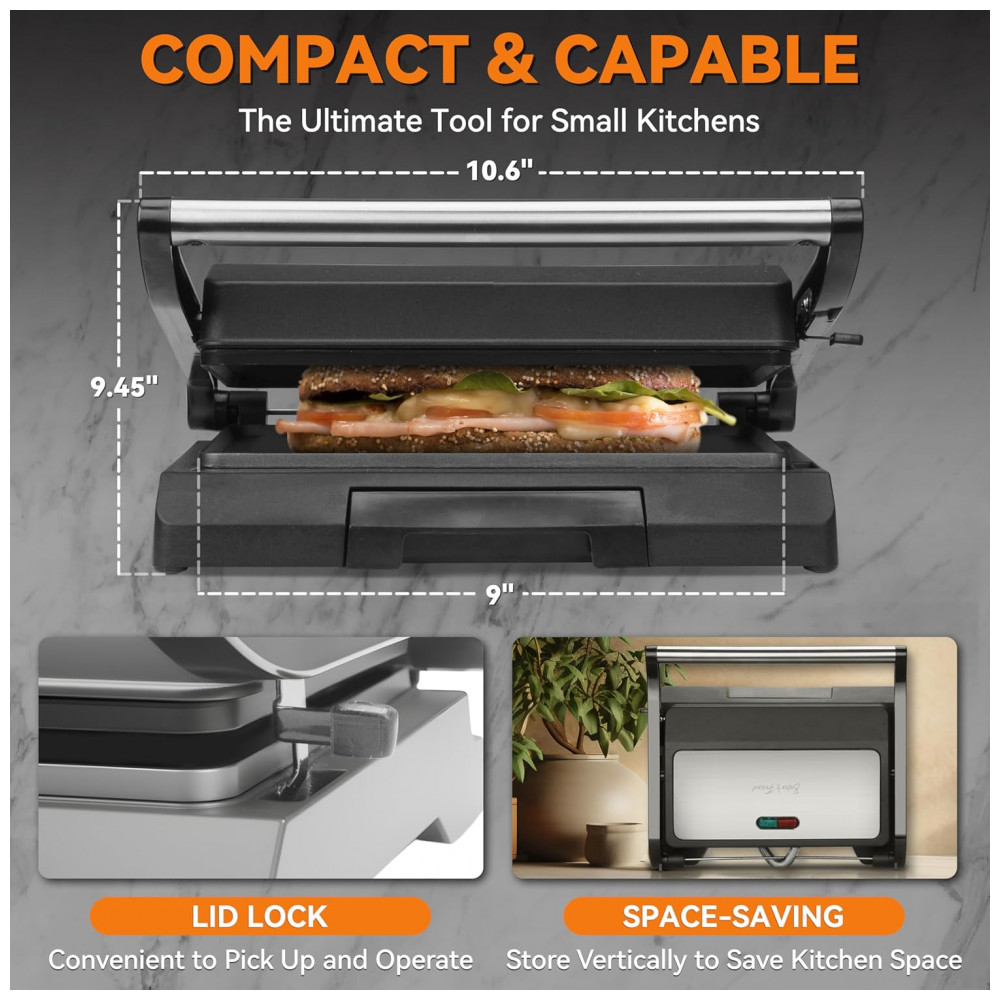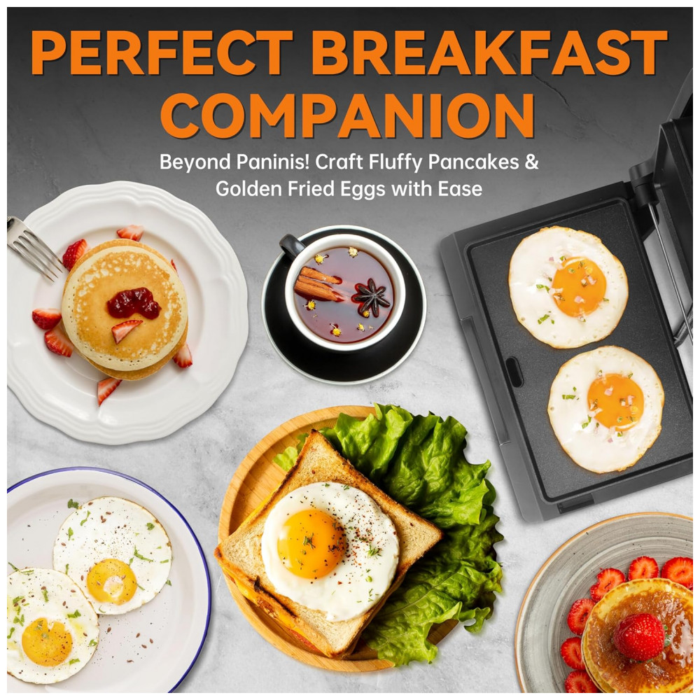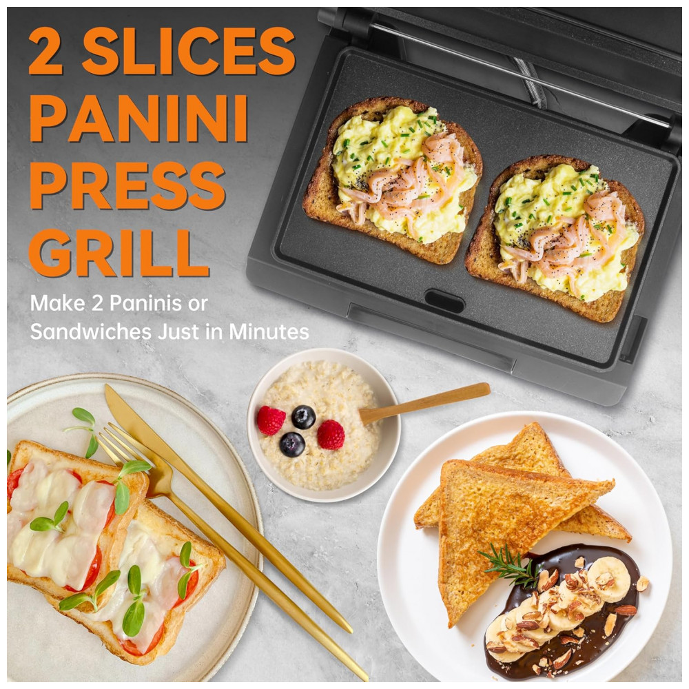 A mini sanduicheira elétrica Baker’s Friend para 2 fatias funciona como grelha plana para paninis, sanduíches, queijos grelhados, panquecas, ovos fritos, carnes e vegetais. Inclui bandeja de óleo integrada e ajuste automático de espessura para diferentes tipos de pão. Opera em 120V com 800W, projetada para uso individual em cozinhas compactas ou dormitórios.