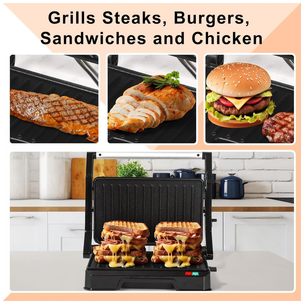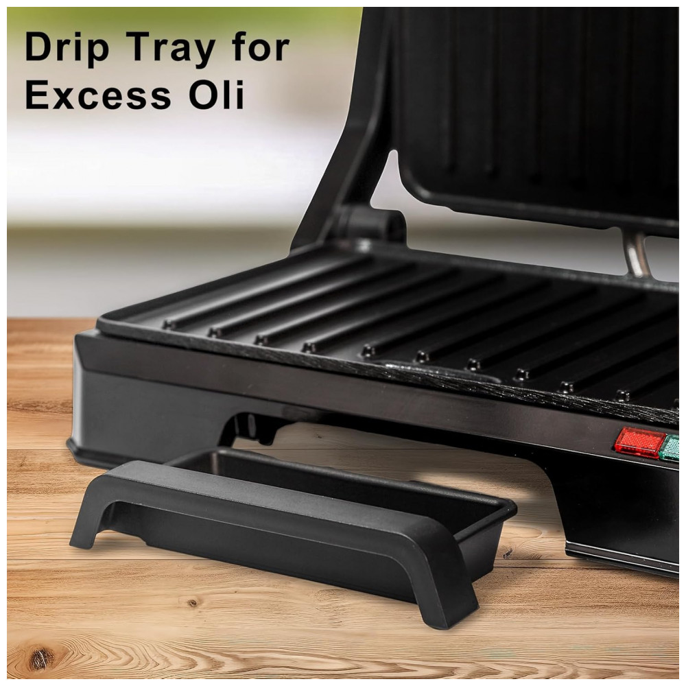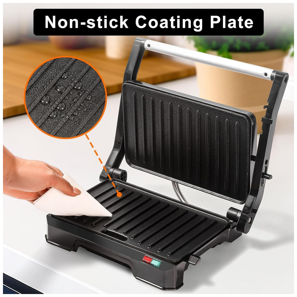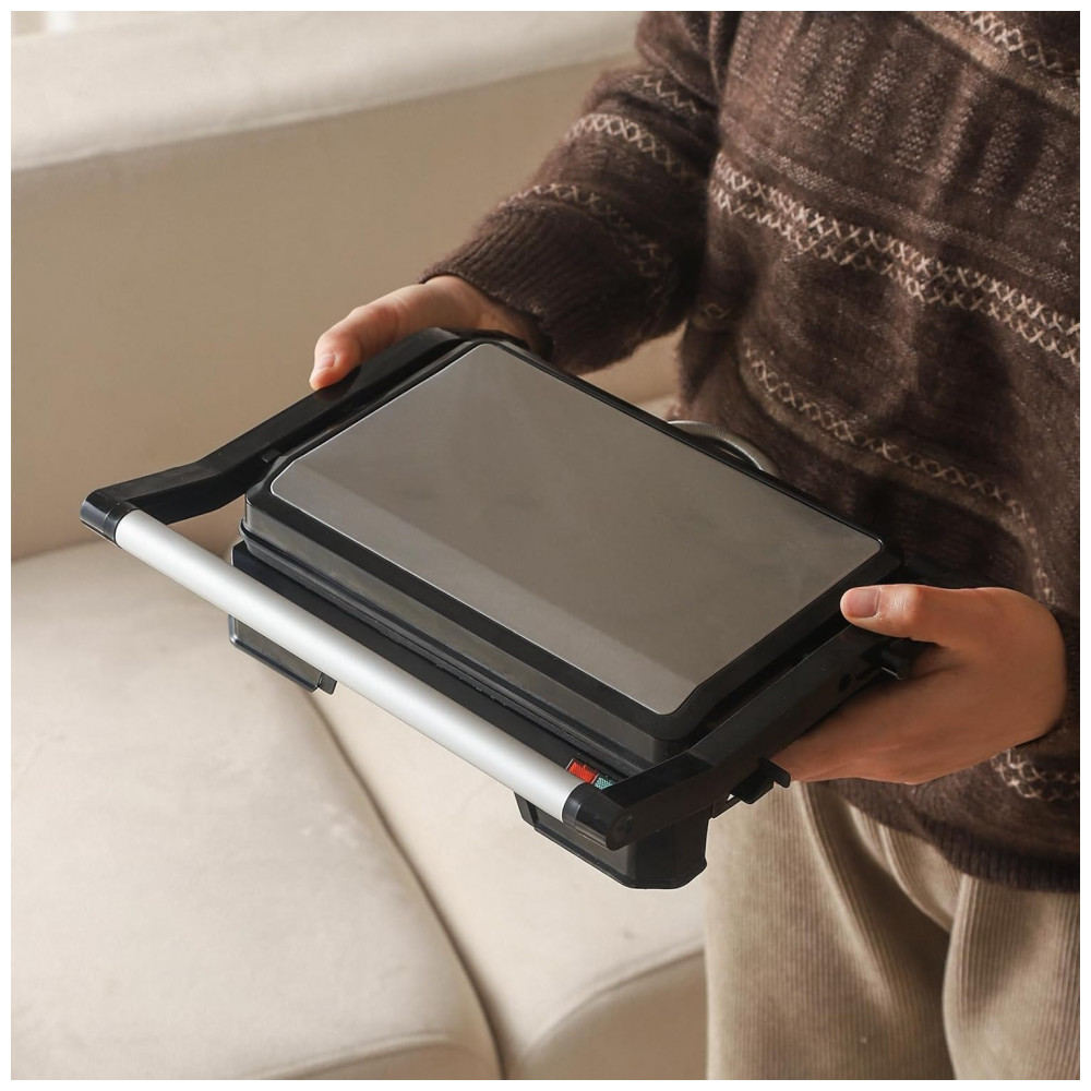 Funcionalidades incluem modo grelha aberta e recolhimento de excesso de óleo para redução de limpeza. Compatível com paninis individuais ou grelhados compactos em ambientes pequenos.