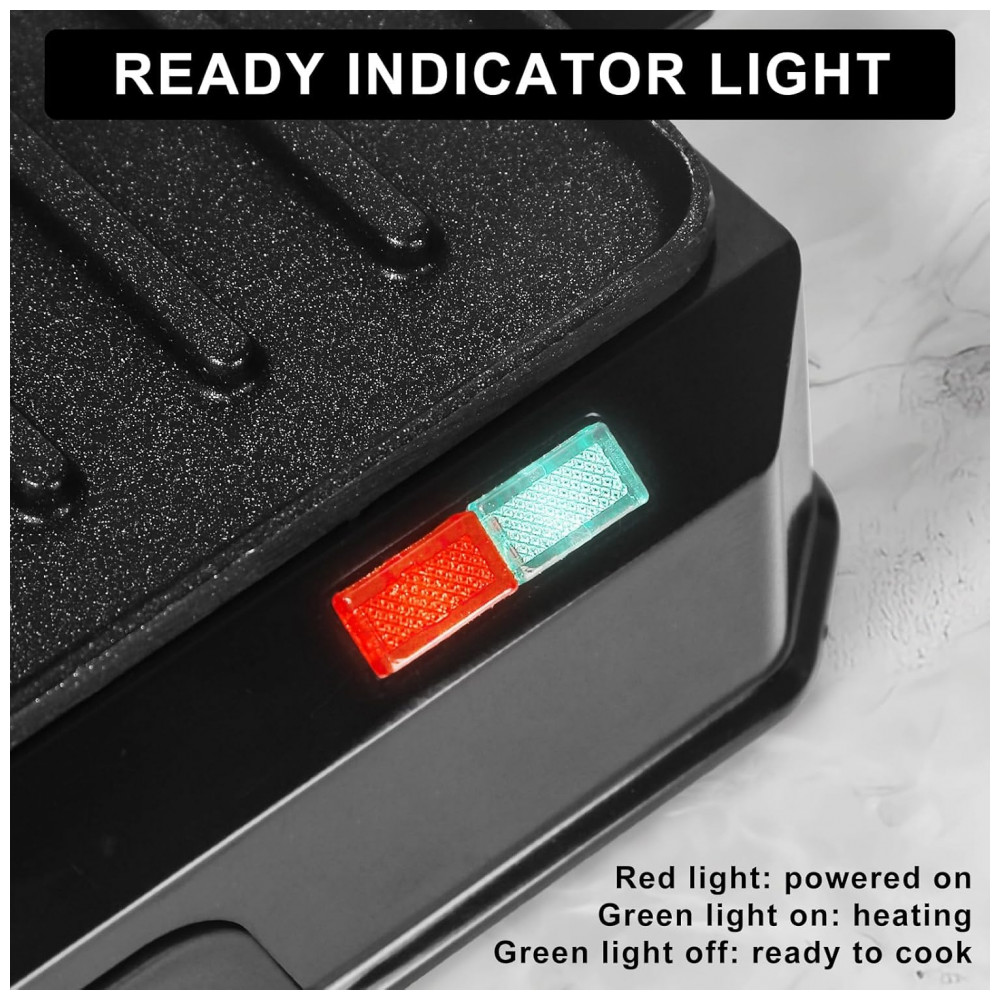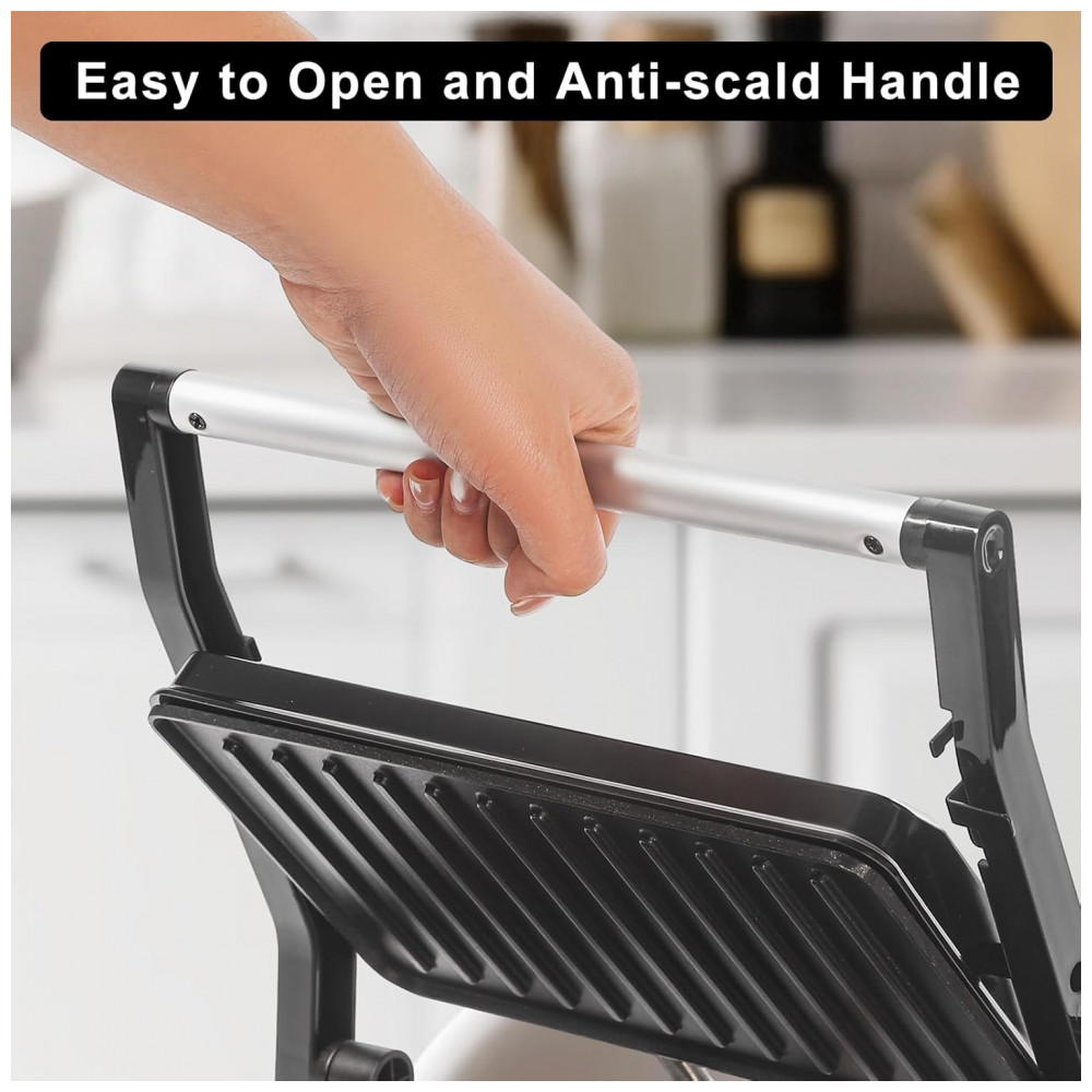 Estrutura em metal e plástico livre de chumbo, PFAS e PFOA, com alça anti-queda e placa antiaderente. Tampa ajustável pela dobradiça acomoda espessuras variadas.