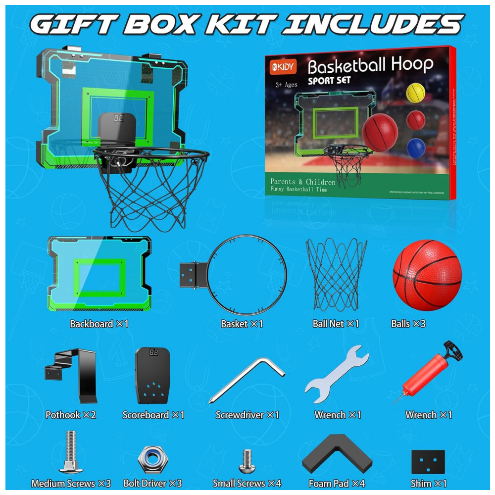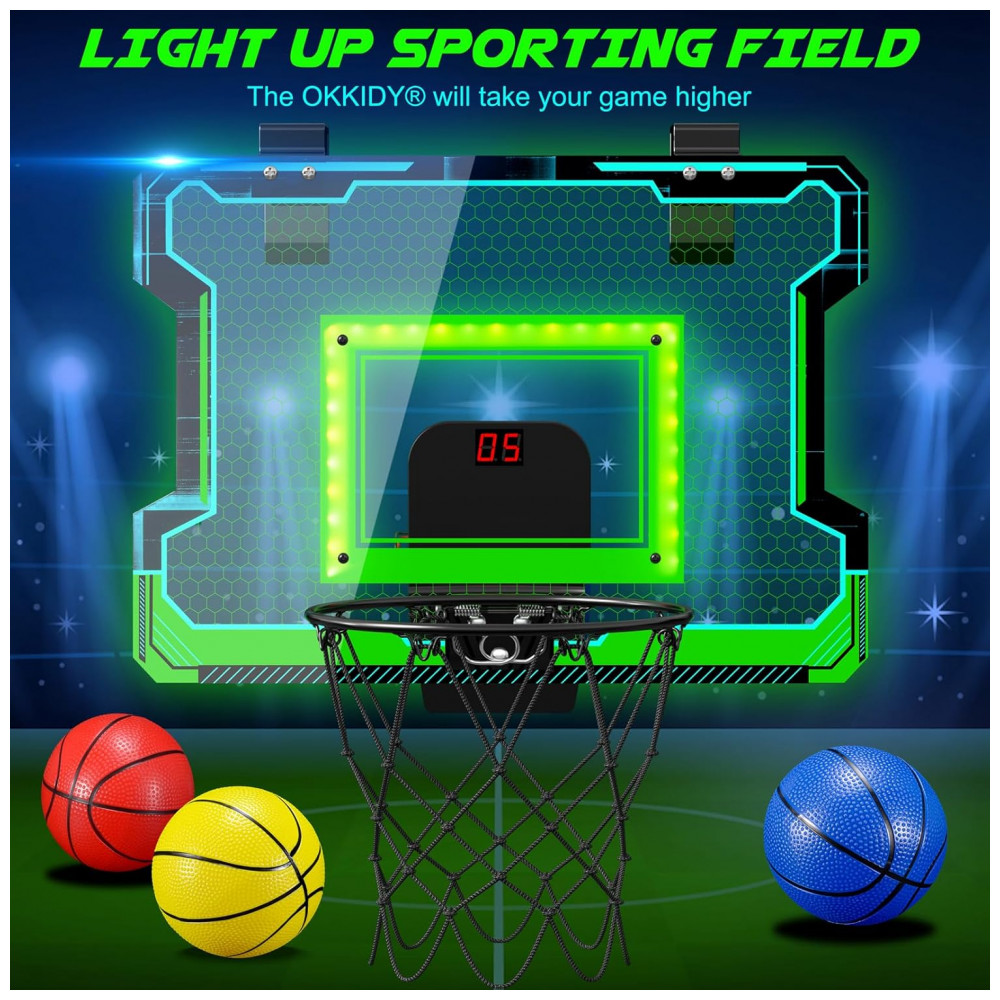 A mini tabela de basquete OKKIDY com placar eletrônico e iluminação LED é um conjunto compacto projetado para ser instalado sobre portas ou superfícies verticais, permitindo partidas de basquete em ambientes internos e externos. O conjunto inclui aro metálico com mola, tabela em policarbonato resistente a impactos, rede, bolas de basquete em tamanho reduzido e sistema eletrônico de pontuação com efeitos sonoros e luminosos. A estrutura é pensada para suportar arremessos e enterradas em escala reduzida, mantendo estabilidade e boa resposta de quique na tabela.