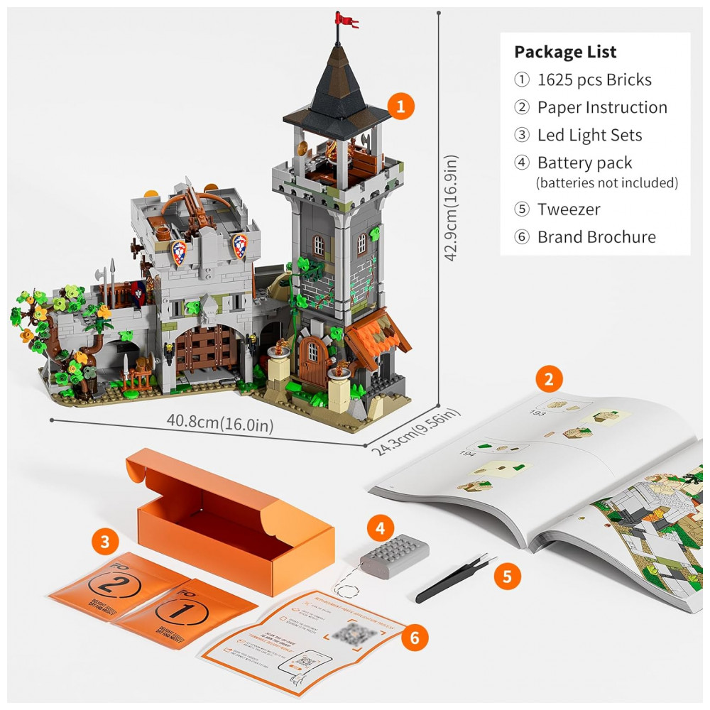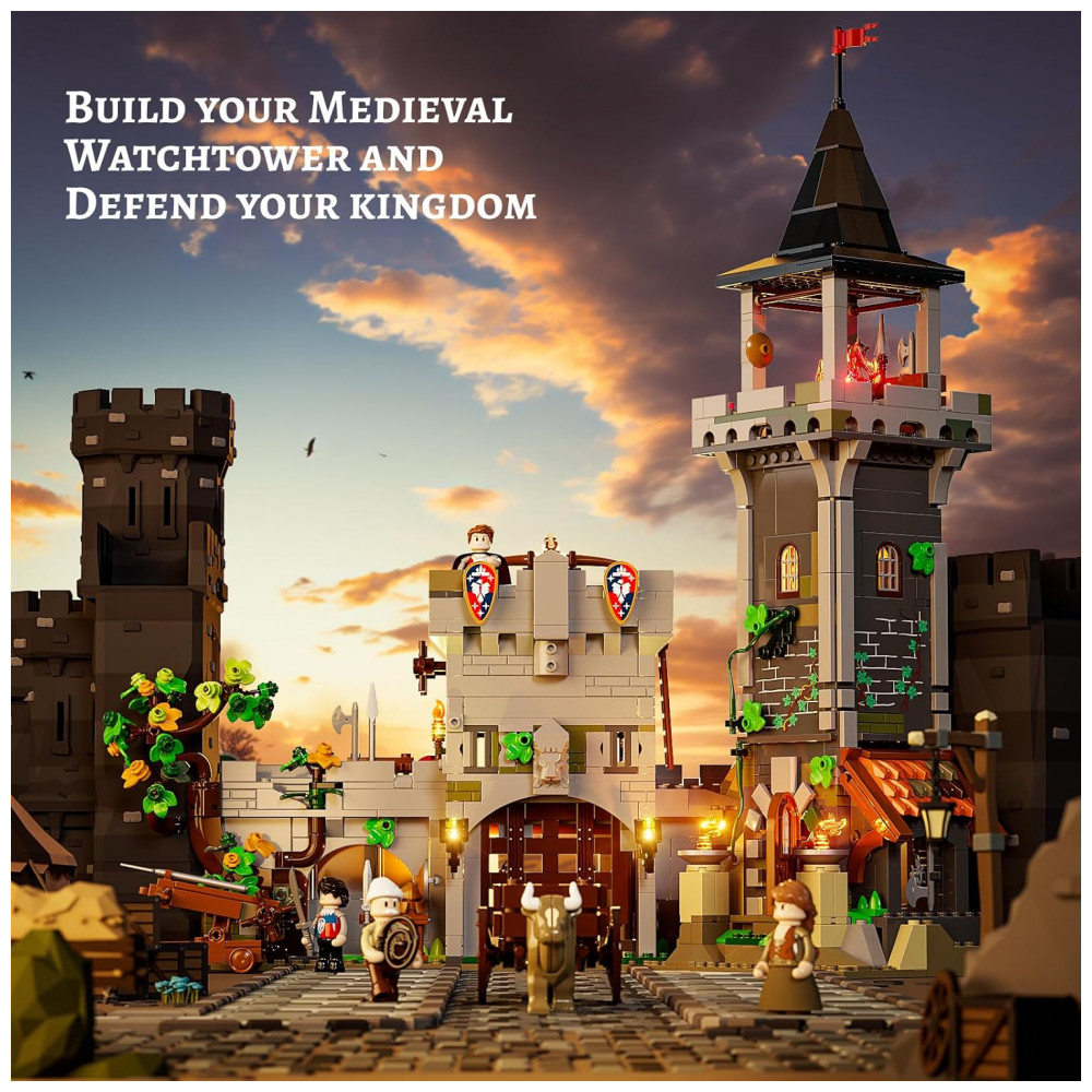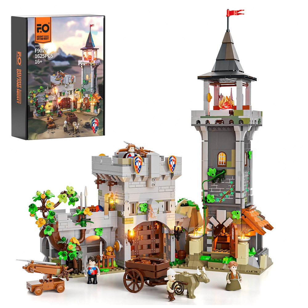Miniatura Castelo Medieval FUNWHOLE Torre de Vigia + Luzes + 1625 Peças + Figuras + Porta Móvel – Modelo F9027 110V