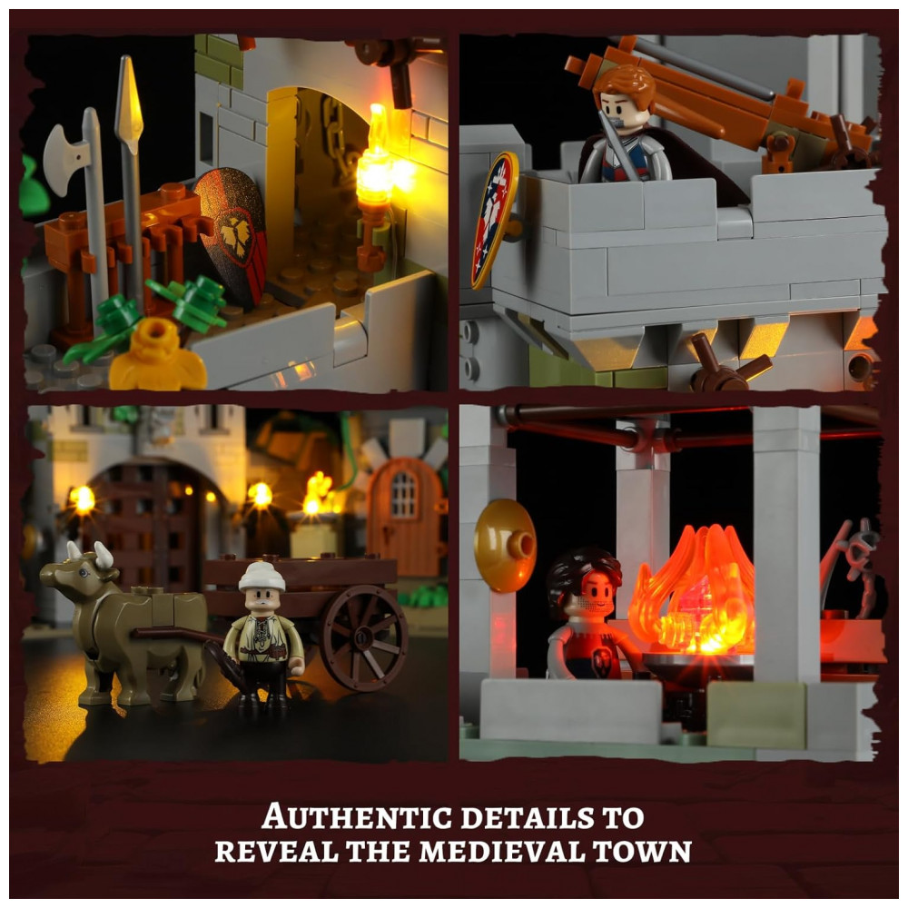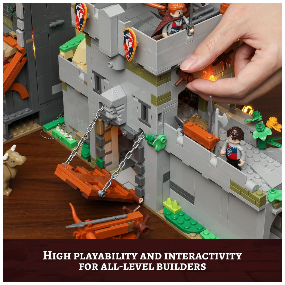 A montagem permite acesso fácil aos compartimentos internos, que incluem miniaturas de ferramentas e armamentos medievais, além de figuras móveis como soldados e agricultores que complementam a ambientação histórica. As dimensões do produto montado são aproximadamente 41 cm (L) x 25 cm (P) x 43 cm (A), facilitando sua exposição como peça de coleção ou decoração temática. Indicada para montadores a partir de 16 anos, a montagem estimula habilidades de coordenação motora, raciocínio lógico e atenção aos detalhes.