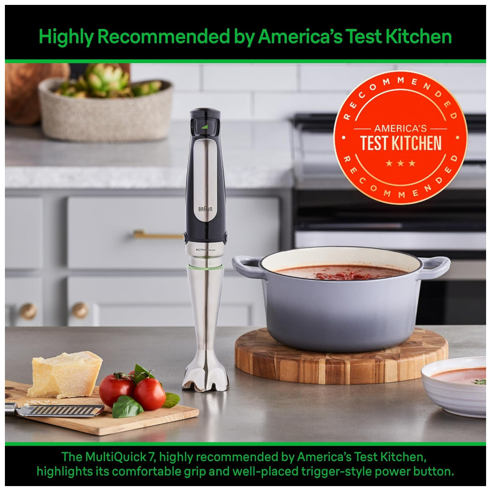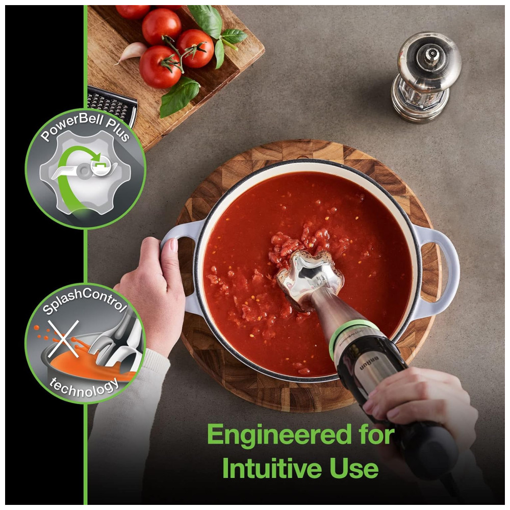 SALPICAR ESTÁ SOB CONTROLE A tecnologia avançada de controle de SPLASH evita salpicos e oferece os melhores resultados de mistura para manter você e sua cozinha limpos. O MQ7 tem 25 menos sucção para manuseio sem esforço e controle perfeito. Comparado com Braun MQ500.
