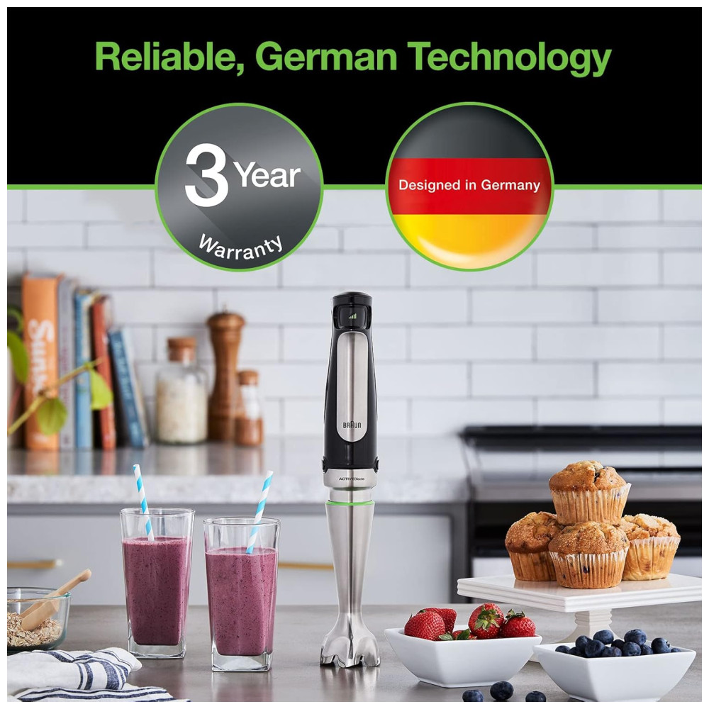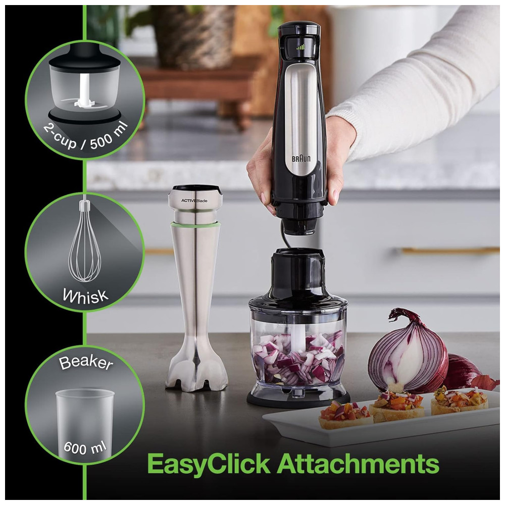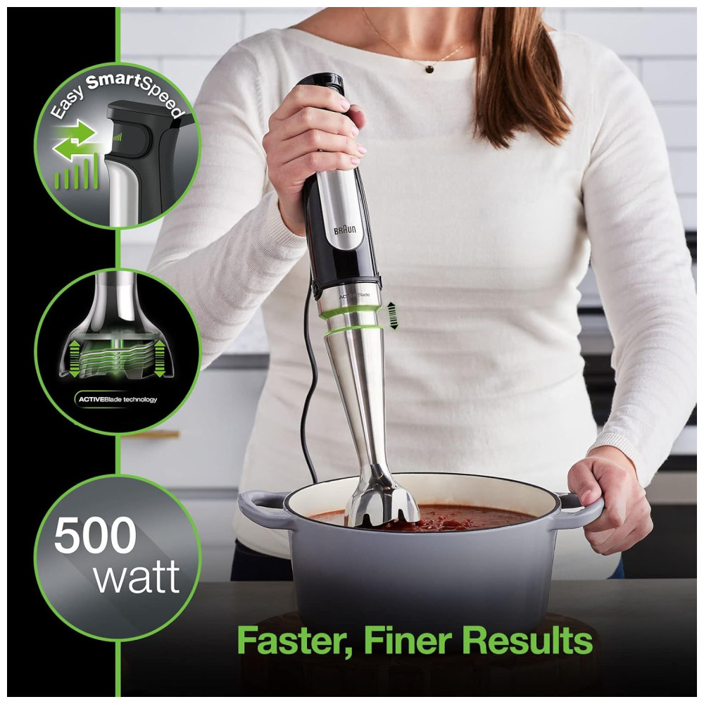 RESULTADOS MAIS RÁPIDOS E FINOS A primeira tecnologia ACTIVEBlade do mundo incorpora um eixo flexível que move a lâmina para cima e para baixo, resultando em uma superfície de corte 250 mais ativa. Este movimento oferece resultados saborosos e suaves, sem peças indesejadas. Os alimentos mais duros não têm chance com o motor de 500 watts. Comparado com Braun MQ700.