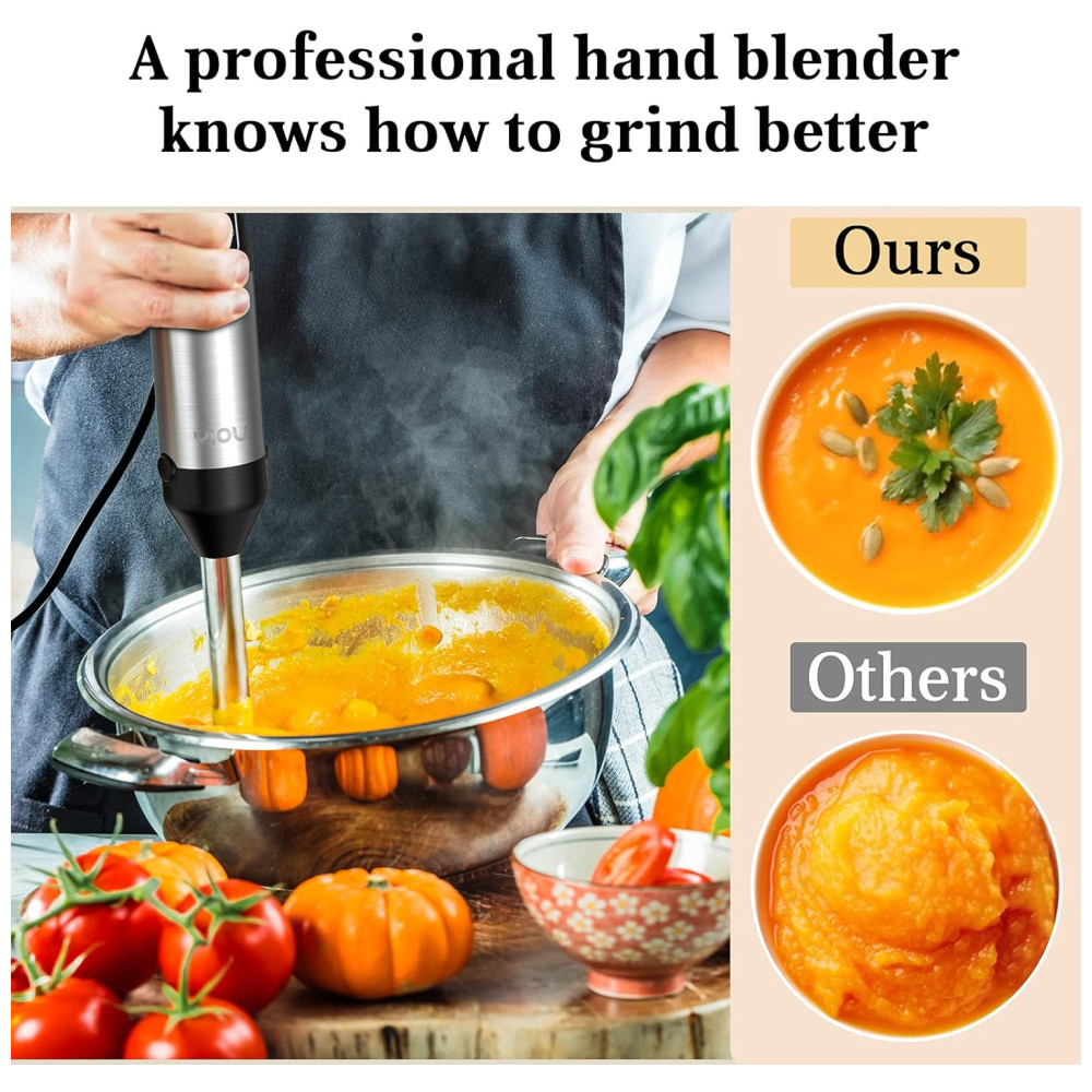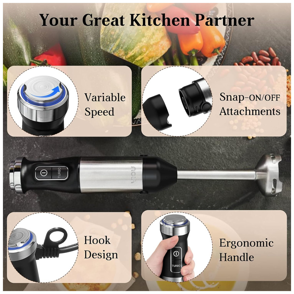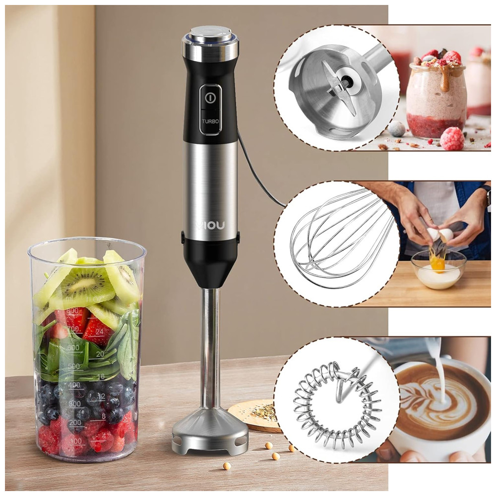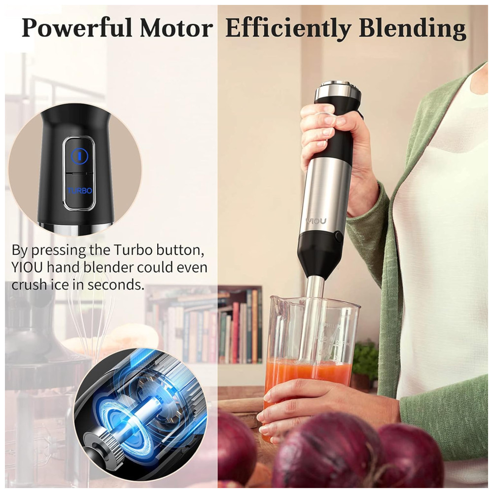 Poderoso e eficiente o liquidificador de imersão YIOU possui um motor potente 500W e lâminas afiadas de aço titânio. que pode lidar facilmente com ingredientes duros, como gelo, nozes e frutas congeladas.