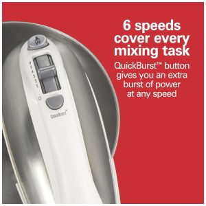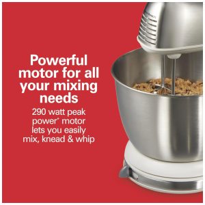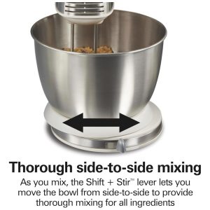 A Batedeira Hamilton Beach Classic Stand Mixer se converte facilmente em uma batedeira de mão. Acompanha 5 acessórios, uma tigela de aço inoxidável de 4 litros e 6 velocidades. Enquanto você mistura, a alavanca Shift Stir permite mover a tigela de um lado para o outro para uma mistura completa. 2 PRODUTOS EM 1. Por que ocupar espaço na sua cozinha com 2 batedeiras quando um eletrodoméstico economizador de espaço faz tudo? A batedeira de pedestal é perfeita para misturas densas como massa de biscoito e pão, e a batedeira de mão desencaixa facilmente da base para trabalhos de mistura rápidos. 5 ACESSÓRIOS E TIGELA DE 4 LITROS DE AÇO INOXIDÁVEL. O conjunto inclui 2 batedores tradicionais, 2 ganchos para massa e um batedor de claras, e a tigela de 4 litros é grande o suficiente para suas receitas favoritas. Para facilitar a limpeza, os acessórios e a tigela podem ir à lava-louças. MOTOR POTENTE PARA TODAS AS SUAS NECESSIDADES DE MISTURA. O motor de 290 watts de potência máxima permite que você facilmente faça de tudo, desde misturar massa e amassar uma massa espessa até bater claras em neve fofas. TIGELA SE MOVE LADO A LADO PARA MISTURAR COMPLETAMENTE. Enquanto você mistura, a alavanca Shift Stir permite mover a tigela de um lado para o outro para uma mistura completa de todos os ingredientes. 6 VELOCIDADES COBREM CADA TAREFA DE MISTURA. Vá desde dobrar ingredientes lentamente até bater em alta velocidade. Essa batedeira de mão possui 6 velocidades para cobrir cada tarefa de mistura e um botão Quick Burst para uma explosão extra de potência em qualquer velocidade. 290 watts de potência máxima.