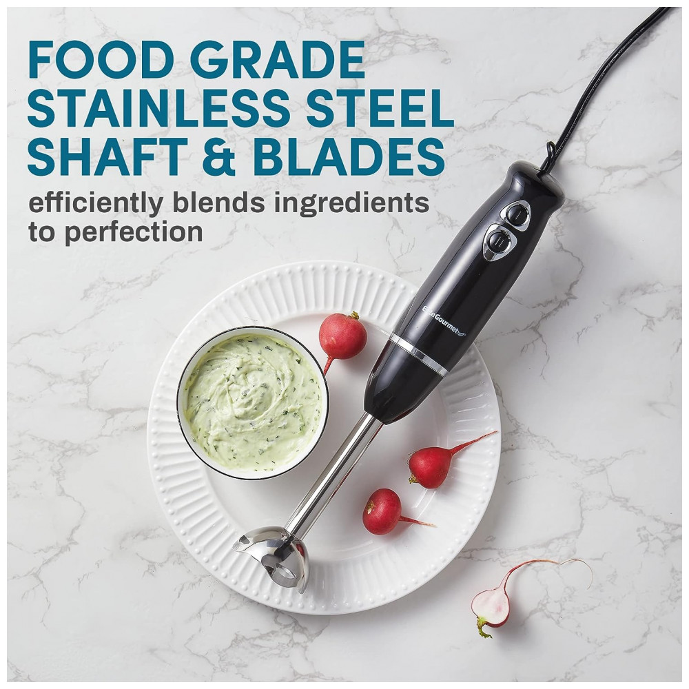 Design compacto e resistente com um eixo de imersão em aço inoxidável fino e elegante para encaixar a maioria das tigelas, xícaras e panelas.