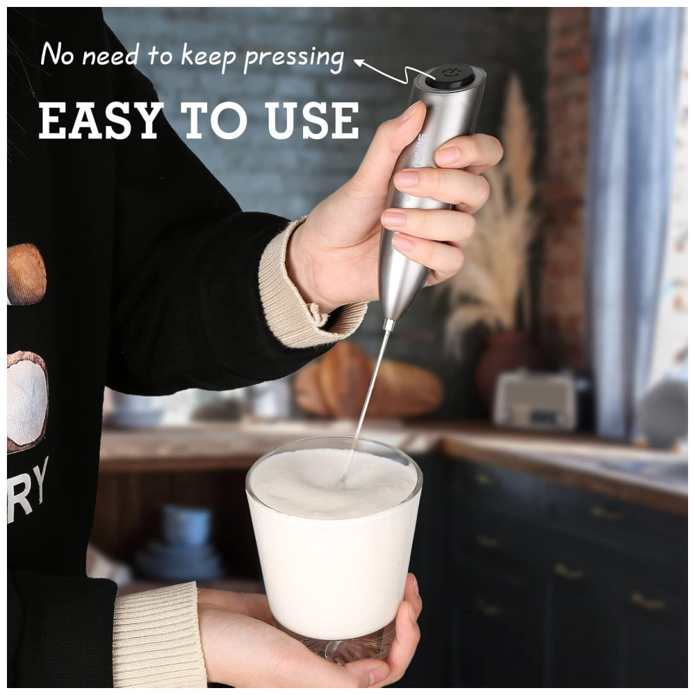 Fácil de usar uma simples pressão para espuma cremosa Basta pressionar o botão liga , desliga uma vez para começar a espumar, sem a necessidade de manter o botão pressionado Relaxe sua mão, aproveite o processo de espumação e bata o leite na consistência desejada