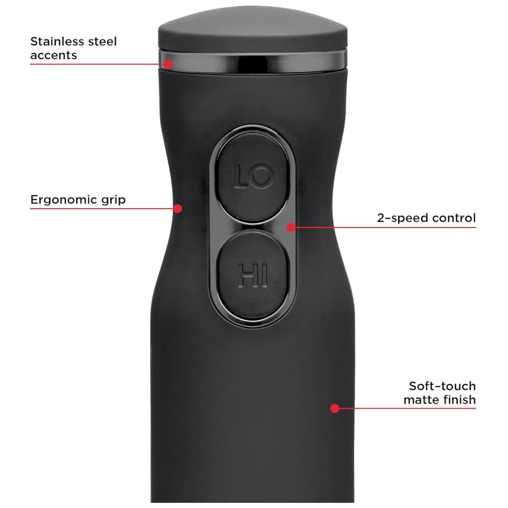 MELHOR MISTURA DE CASA O liquidificador de imersão silencioso e de alta velocidade de 300 watts transforma alimentos e pica gelo com o toque de um botão. Desfrute de um processo de mistura fácil com 2 velocidades de um toque HI e LO. O design elegante e ergonômico de fácil manuseio com acabamento de toque suave foi desenvolvido para colocar o poder do purê na palma da sua mão, para resultados uniformes em segundos.