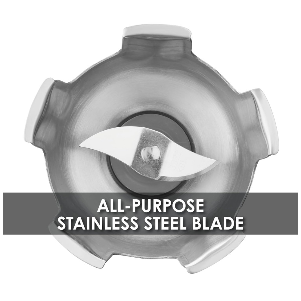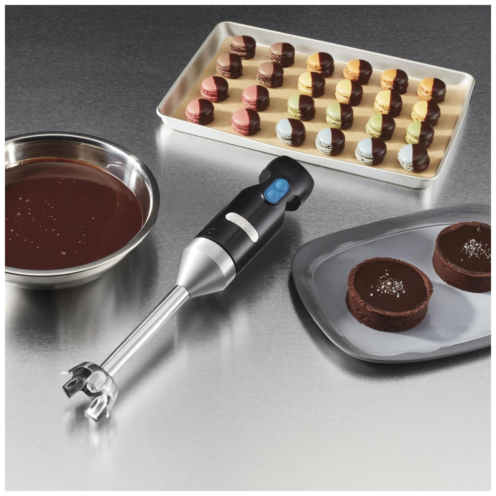 Seu eixo fixo e selado de 17 cm, juntamente com a lâmina de aço inoxidável 301 para todos os fins, assegura mistura e emulsão eficientes em todas as receitas. A alça ergonômica proporciona conforto durante o uso prolongado, enquanto os controles de botão de toque garantem operação simples e intuitiva.